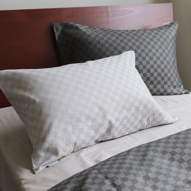 市松模様がシンプルでシックな「マス」 当店のベッドリネンの中でも、長年にわたって多くの人に愛されているヒットアイテムです。 シンプルなデザインは主張しすぎず、上品にお部屋の品格をアップしてくれます。 和風のお部屋にも、モダンな洋風のお部屋にも合うマルチな枕カバーです。 男女問わず使用でき、贈り物にもよろこばれます。