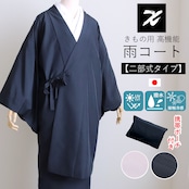 和装用の二部式雨コートです。大切なお着物を雨から守るUVカット、撥水加工、接触冷感がついた高機能な雨コートです。二部式のため身長を気にせず着用できます。上着のみ着用で塵除けとしてもお使い頂けます。携帯ポーチ付きでお出かけ時にも安心。晴れの日はもちろん、雨の日にも対応できる晴雨兼用アイテムです。撥水加工が施されているため、雨をしっかりと防ぎつつ、UV加工により日差しからも守ります。また、接触冷感機能が付いているため、暑い日でも快適に着用できます。塵除けとしても優秀で、道中着コートとしてもご利用いただけます。落ち着いたデザインは、さまざまなシーンにマッチし、スタイリッシュにお過ごしいただけます。