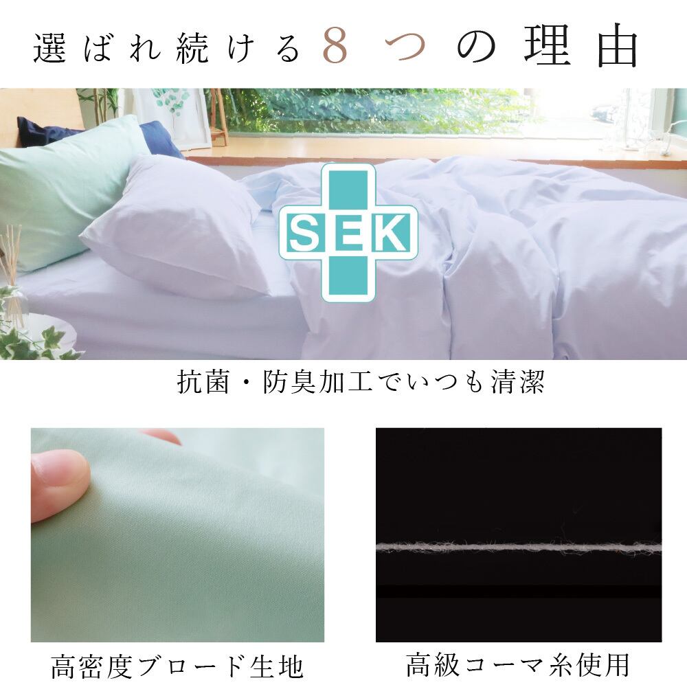 シンプルモダンの暮らしを実現出来るお洒落なベッドルームに。お揃いで掛け布団カバーやフラットシーツ・ボックスシーツもございます。あなたのセンスで全ての色を変えてのコーディネートも楽しめます。毎日使う寝具は、上質で長く使いたいもの。無駄な繊維を取り除いた200本ブロードの高級糸で織られているため、毛羽立ちが少なく爽やかな肌触りです。繊維メーカーが本当に使って欲しいと思う綿100%の日本製ベッドリネンです。高級糸「コーマ200」 の毛羽立ちのない滑らかな極上の肌触りと、抗菌防臭SEK加工を施した清潔な寝具に最適な生地汗ばむ季節もジャブジャブ洗えるお手入れ簡単な寝具をお楽しみくださいませ。