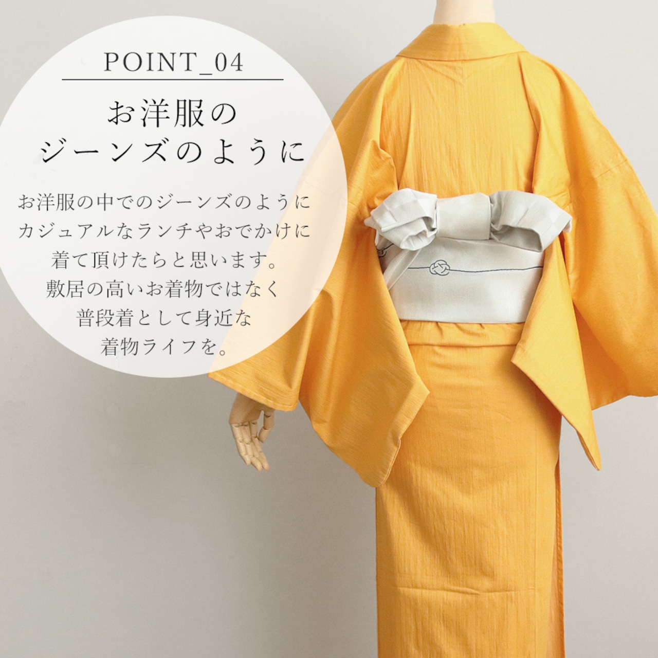 ストレッチ性の『デニム着物』。ストレッチ性のある糸を使う事で、デニム特有の固さやごわつきがなく、動きやすく着心地抜群の生地です。カラーデニムは、機能性だけでなく、見た目にも着やすく上品な装いができるようデザインしました。長年、弊社を代表する大変人気のお着物です。綿織物産地の浜松で、長年繊維業を営んできた弊社が試作を繰り返し完成させた自信のデニム着物。デニムのカジュアルな中にもキリっとした着心地の良いカラーデニムをお楽しみください。