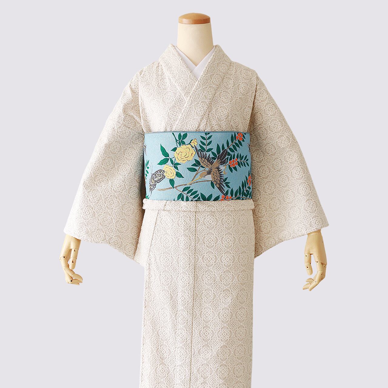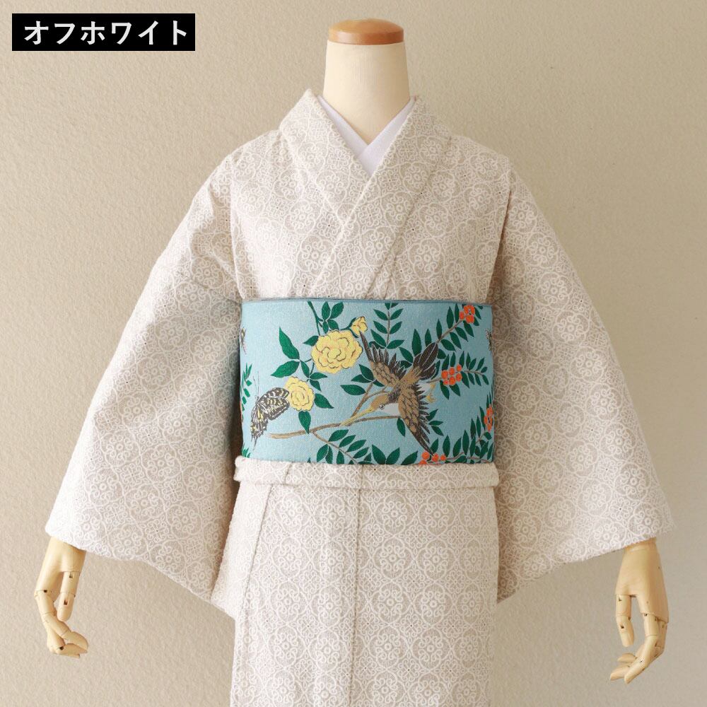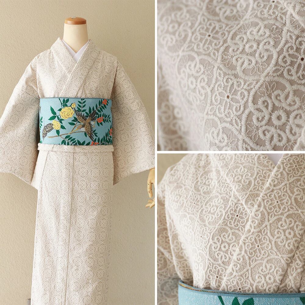 エレガントなレース調のフェミニンな雰囲気のお着物。オフホワイトカラーが上品さと清楚感を醸し出します。IKSは、洗練された大人の女性のカジュアルな着物ライフを応援する為に、レースや独特の素材を使い他にはないような上品さと華やかさを併せ持つ和装商品を企画製造しています。