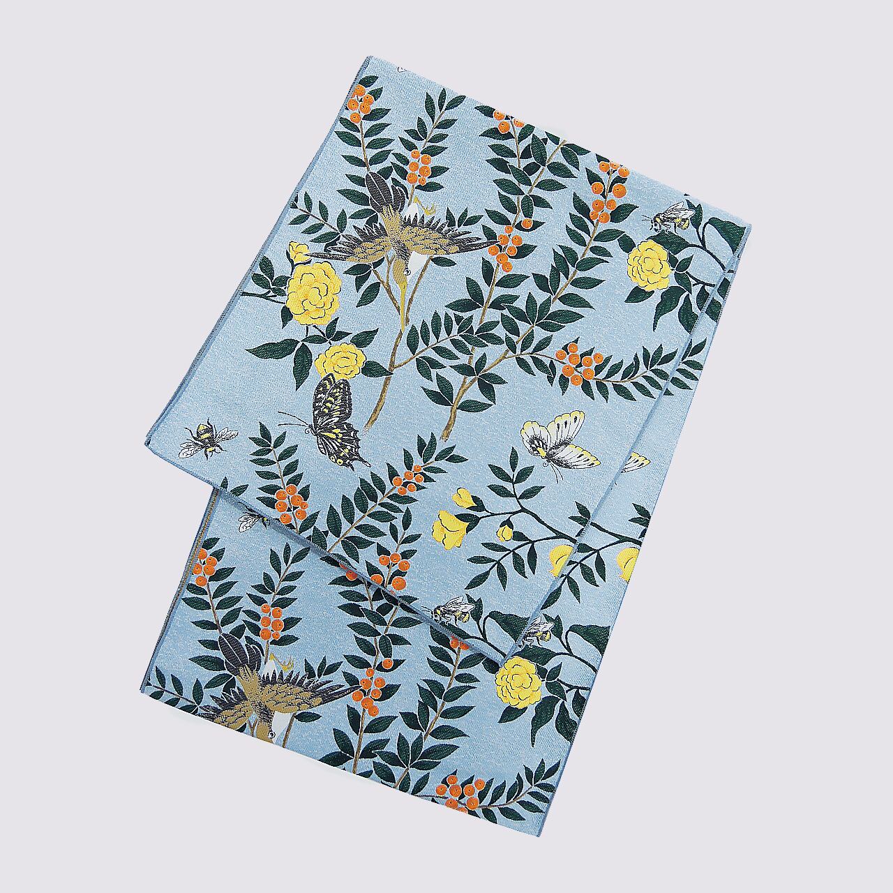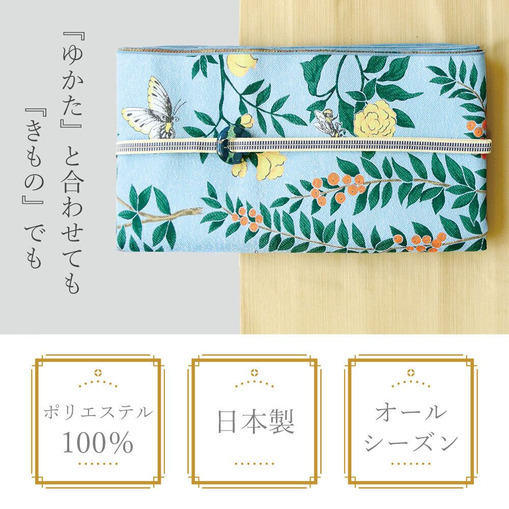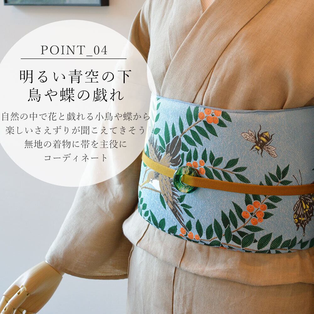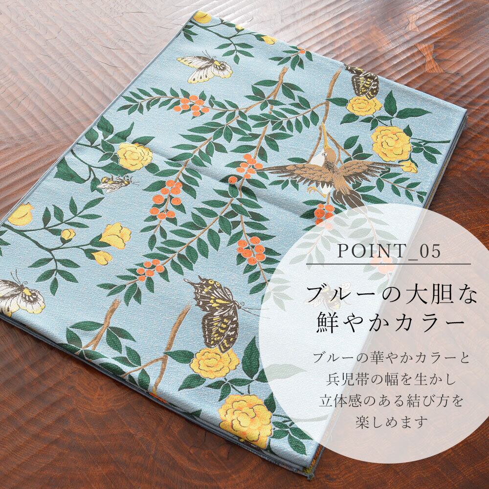 エレガントで上品なナチュラルライクな兵児帯。青空の下小鳥とお花と戯れる自然な風景画は見る人にも癒しを与え、斬新で映える兵児帯となります。無地な着物のに合わせやすく優しさの絵画のように”今”を感じる愛らしいデザインです。プリントで柄を表現するのではなく、糸の色によって織りで表現したジャガード素材。様々な糸を使用し生地の模様や柄が立体的に表現されています。他にはない貴重な華やか帯です。