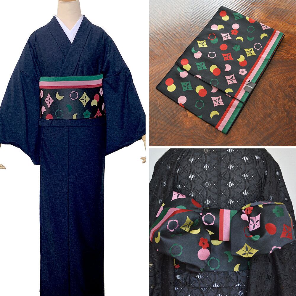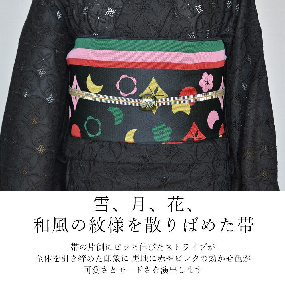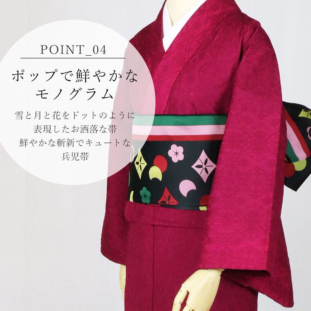 ポップで鮮やかなモノグラム柄で和のイメージを覆すような斬新な兵児帯。カラフルなお色が落ち着いたレースや無地の着物に遊び心を持たせてくれます。雪と月と花柄をドットのように表現したお洒落な帯。いつもと違う華やかさが欲しい時に欲しい一品です。