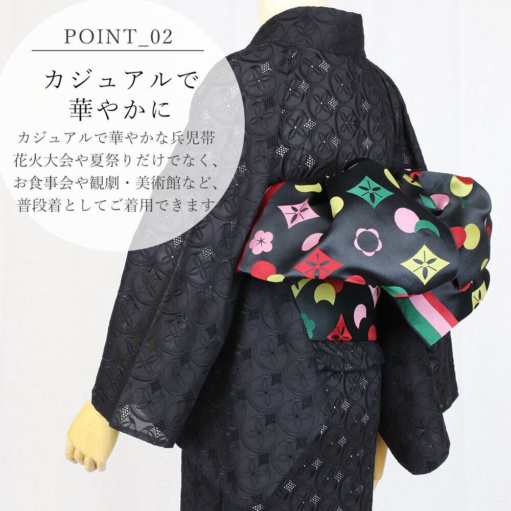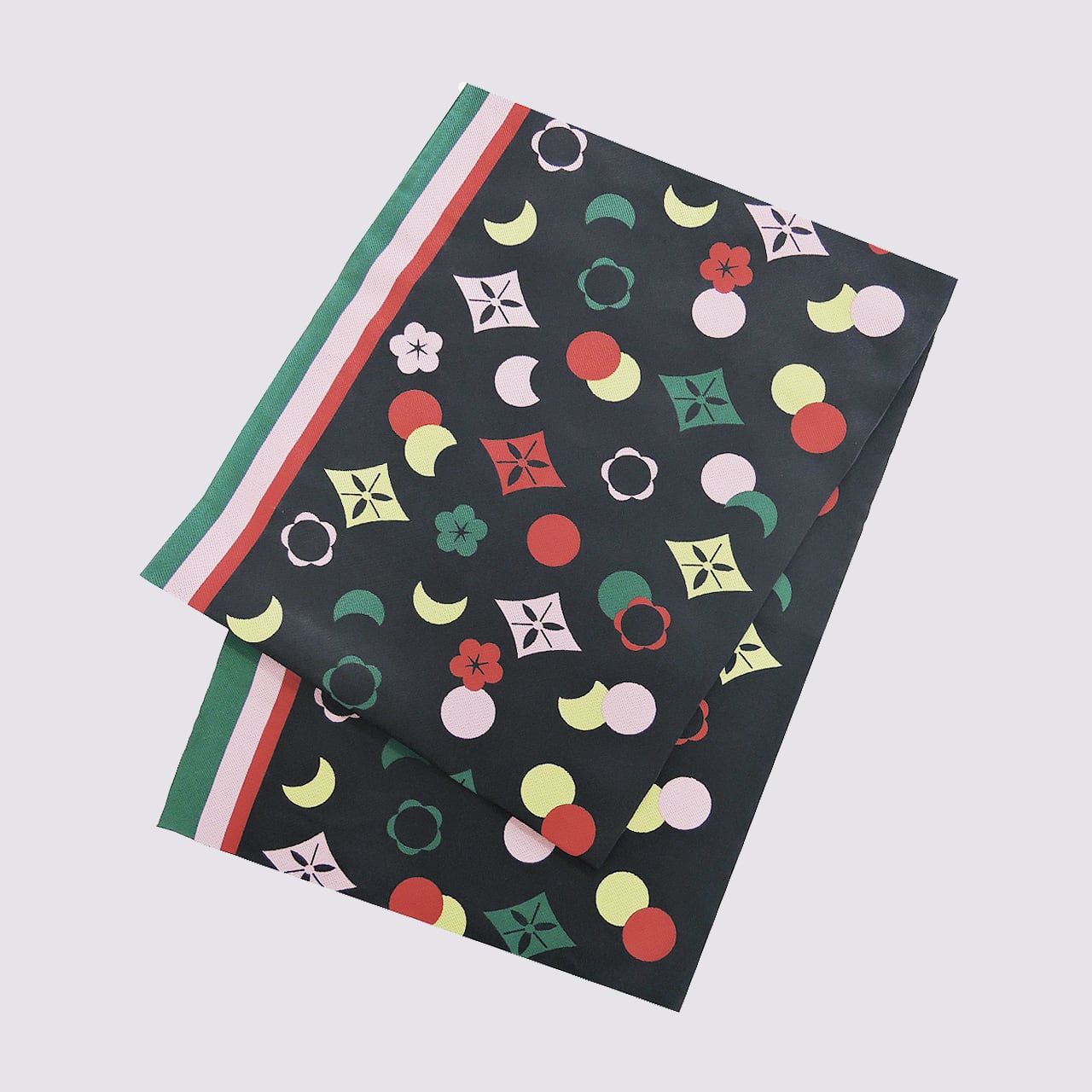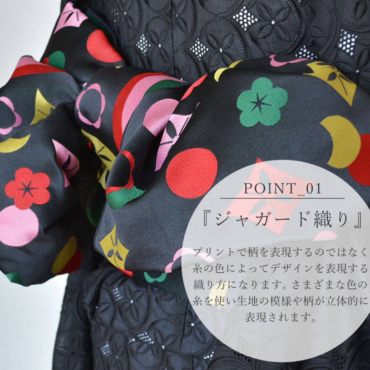 ポップで鮮やかなモノグラム柄で和のイメージを覆すような斬新な兵児帯。カラフルなお色が落ち着いたレースや無地の着物に遊び心を持たせてくれます。雪と月と花柄をドットのように表現したお洒落な帯。いつもと違う華やかさが欲しい時に欲しい一品です。