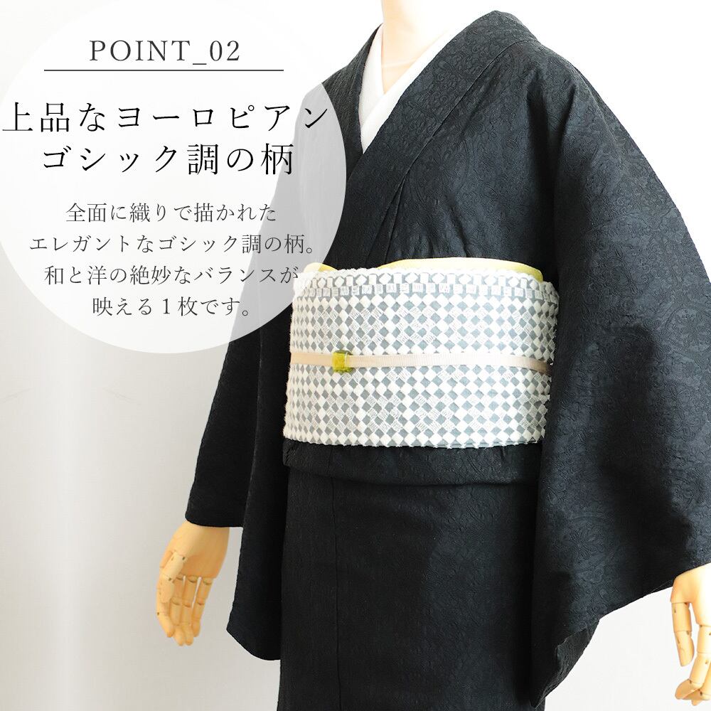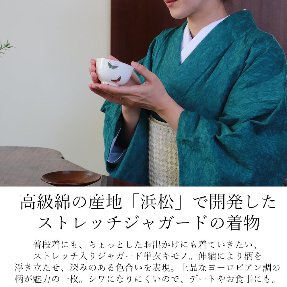 高級綿の産地として有名な『浜松市』浜松で研究開発されたストレッチ素材の弊社オリジナルお着物です。動きやすくお出かけ時の立ったり座ったりが楽々なので、長時間着用しても窮屈さを感じにくい素材です。薄すぎないバティックジャガード生地でさらに高級感とエレガントさを兼ね備えたヨーロピアン柄。同系色なので目立ちすぎず上品な装いです。綿素材のお着物ですので、手洗いにてお洗濯可能でお手入れもラクラク。