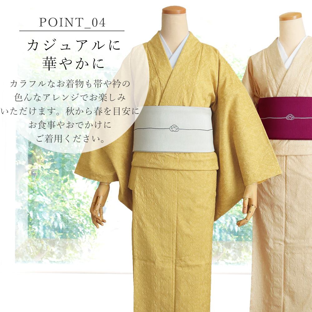 弊社榎本では素材開発まで手掛けており、自社オリジナル素材のバティックジャガード着物は、お着物ライフを楽しまれる皆様に長年長年愛用されている商品です。若い方からご年配の方まで、お着物初心者の方にもおすすめのお着物です。
