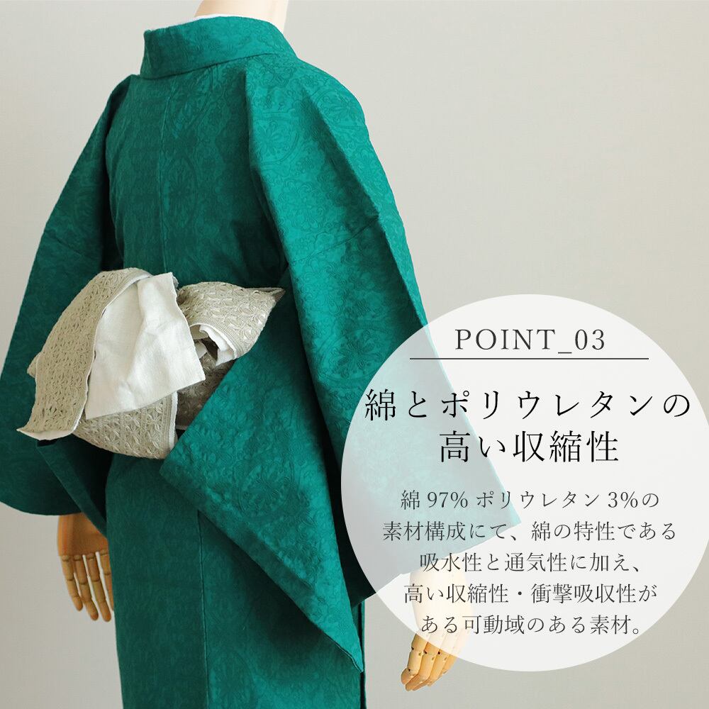 高級綿の産地として有名な『浜松市』浜松で研究開発されたストレッチ素材の弊社オリジナルお着物です。動きやすくお出かけ時の立ったり座ったりが楽々なので、長時間着用しても窮屈さを感じにくい素材です。薄すぎないバティックジャガード生地でさらに高級感とエレガントさを兼ね備えたヨーロピアン柄。同系色なので目立ちすぎず上品な装いです。綿素材のお着物ですので、手洗いにてお洗濯可能でお手入れもラクラク。