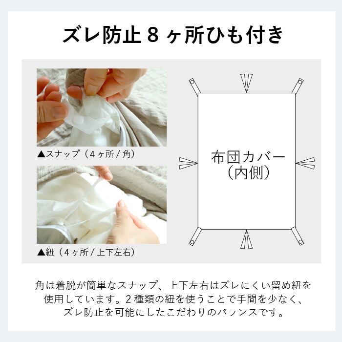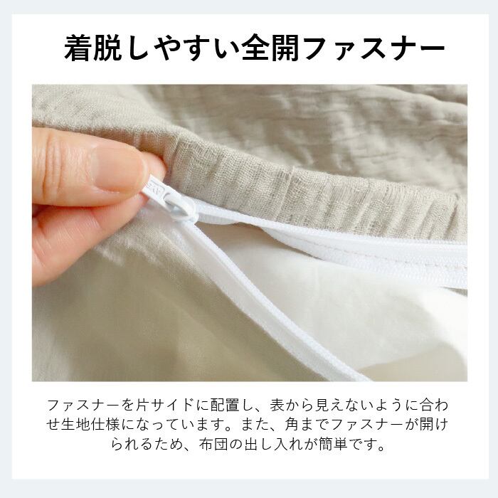 忙しい毎日にぴったりの掛布団カバーです!速乾性があるので、洗濯後もすぐに使えてとっても便利。ノンアイロン仕様だから、手間いらずでいつでもきれいに保てます。表生地は楊柳ガーゼで、さらっとした肌触りが心地よく、裏生地のピーチスキンが優しいぬくもりを提供します。シンプルな無地デザインで、洗練された雰囲気を演出。ダークベージュとチャコールグレーの落ち着いた色合いが、どんなインテリアにもマッチします。