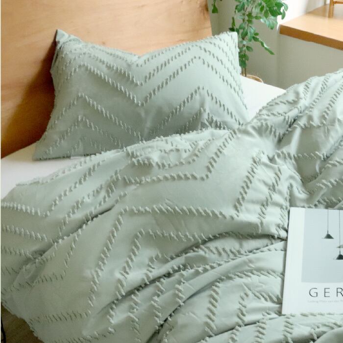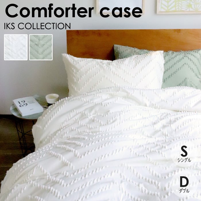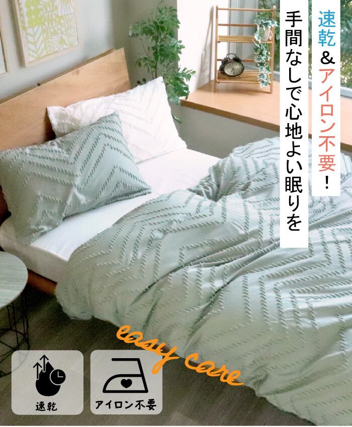 この掛け布団カバーは、北欧風の幾何柄がとってもおしゃれ!肌に当たる裏生地はピーチスキン加工で肌触りが良く、表生地のカットジャガードのデザインが立体感を演出します。速乾性があるので、洗濯後もすぐに使えて便利。ノンアイロン仕様だから、忙しい日々でも手間いらずです。ホワイト、グリーンの2色展開で、お部屋の雰囲気に合わせて選べます。シングルとダブルのサイズがあり、どんなベッドにもぴったりです!
