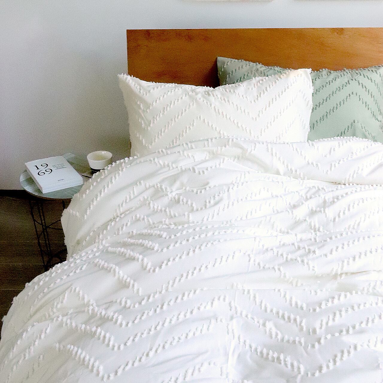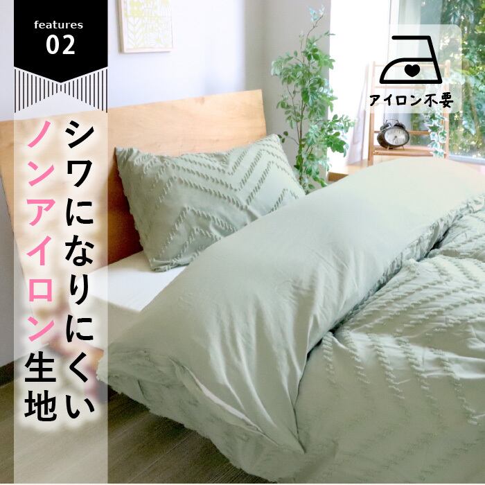 この掛け布団カバーは、北欧風の幾何柄がとってもおしゃれ!肌に当たる裏生地はピーチスキン加工で肌触りが良く、表生地のカットジャガードのデザインが立体感を演出します。速乾性があるので、洗濯後もすぐに使えて便利。ノンアイロン仕様だから、忙しい日々でも手間いらずです。ホワイト、グリーンの2色展開で、お部屋の雰囲気に合わせて選べます。シングルとダブルのサイズがあり、どんなベッドにもぴったりです!