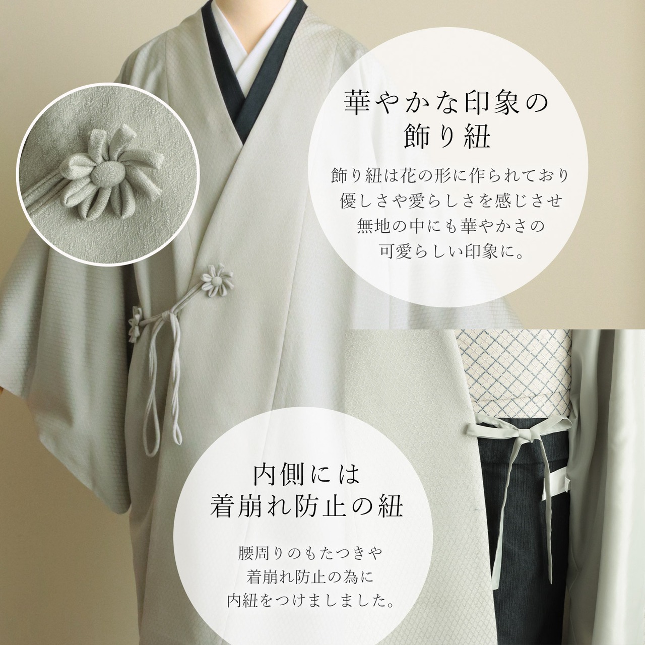 シルクの上品で美しい艶感が魅力の道中着。単なる無地ではなくドビー織機で地紋織り込んだ深みのある生地感が魅力です。柄はベーシックな市松とダイヤの2柄からお選び頂けます。袷せ仕様なので秋冬の寒いシーズンの防寒にぴったりの和装道中着です。