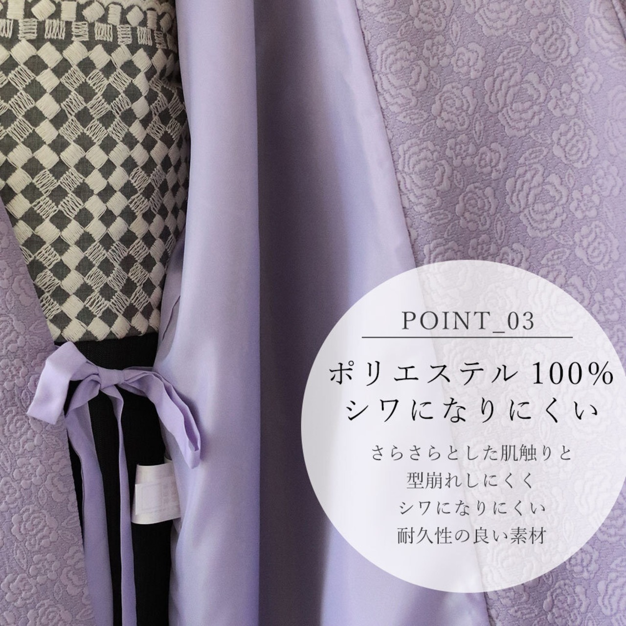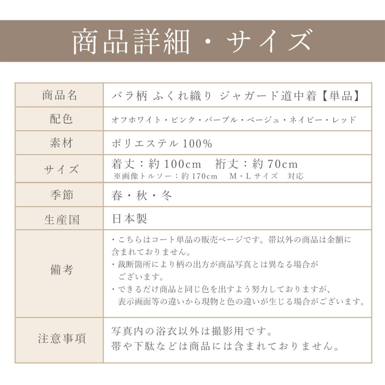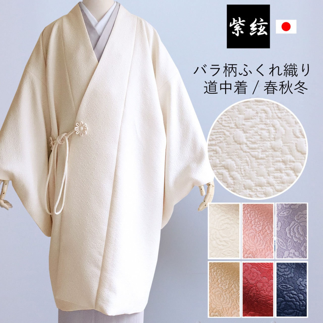 ジャカード織の生地、ふっくらエレガントな薔薇柄が華やかで上品なイメージ。着物の上にさっと羽織るだけでドレスアップした着こなしに。お出かけからお稽古事など幅広く使えます。着物とのコーディネートを楽しむことはもちろん、袷せ仕立てで100cm丈の安心な長さなので防寒になりますし、また塵除けにもなる便利な1枚です。光沢感のある素材で高級感も漂い、上質で丁寧な縫製なので納得の1枚となるでしょう。前右で結ぶ飾り紐は花の形に作られており、優しさ、愛らしさを感じさせます。