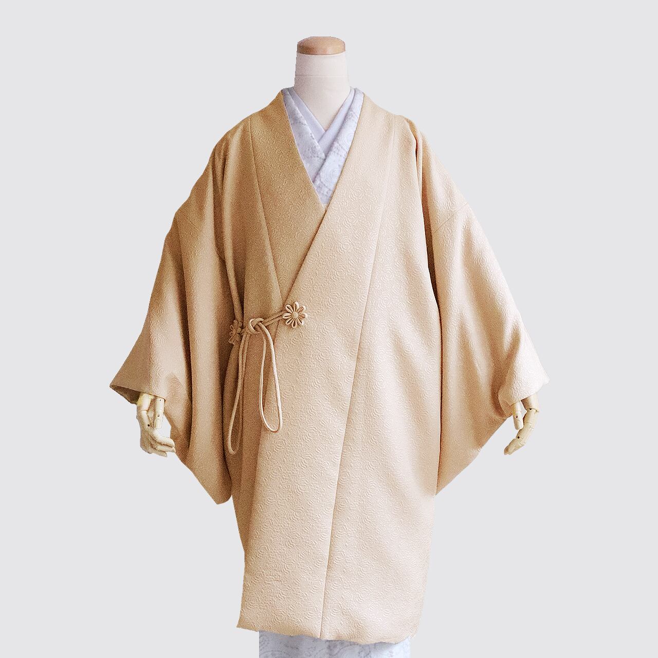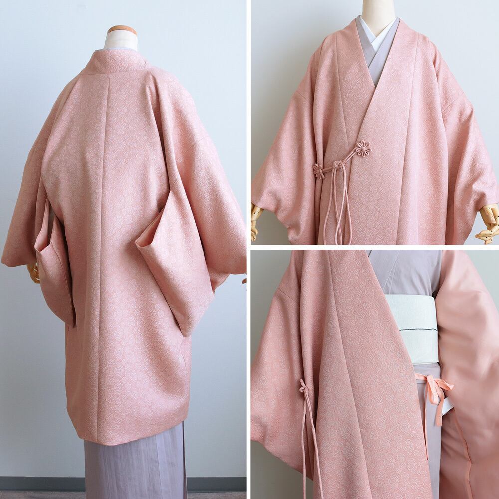 ジャカード織の生地、ふっくらエレガントな薔薇柄が華やかで上品なイメージ。着物の上にさっと羽織るだけでドレスアップした着こなしに。お出かけからお稽古事など幅広く使えます。着物とのコーディネートを楽しむことはもちろん、袷せ仕立てで100cm丈の安心な長さなので防寒になりますし、また塵除けにもなる便利な1枚です。光沢感のある素材で高級感も漂い、上質で丁寧な縫製なので納得の1枚となるでしょう。前右で結ぶ飾り紐は花の形に作られており、優しさ、愛らしさを感じさせます。