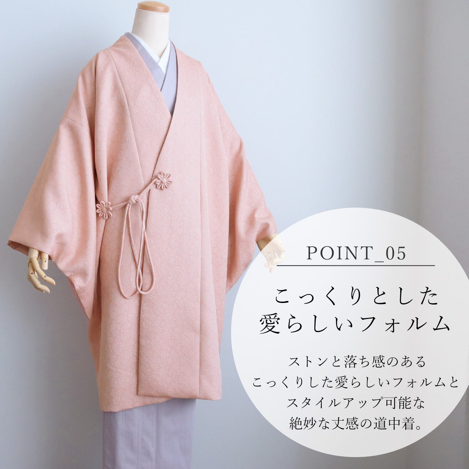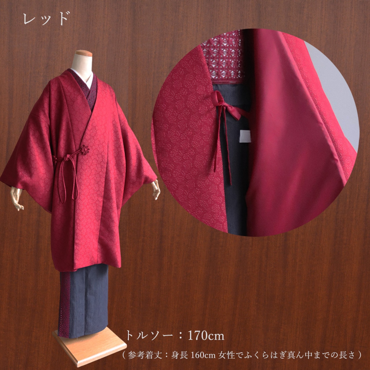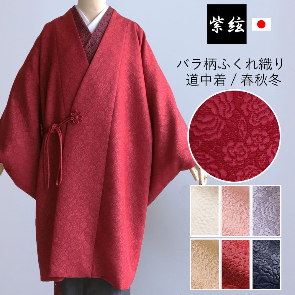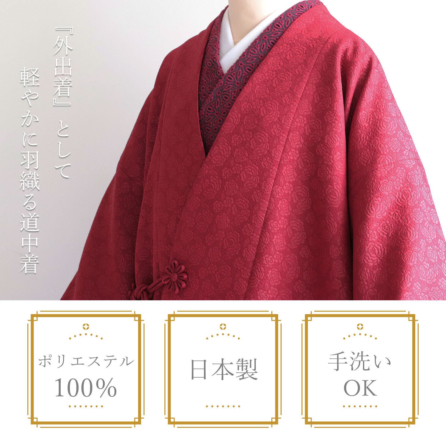 ジャカード織の生地、ふっくらエレガントな薔薇柄が華やかで上品なイメージ。着物の上にさっと羽織るだけでドレスアップした着こなしに。お出かけからお稽古事など幅広く使えます。着物とのコーディネートを楽しむことはもちろん、袷せ仕立てで100cm丈の安心な長さなので防寒になりますし、また塵除けにもなる便利な1枚です。光沢感のある素材で高級感も漂い、上質で丁寧な縫製なので納得の1枚となるでしょう。前右で結ぶ飾り紐は花の形に作られており、優しさ、愛らしさを感じさせます。