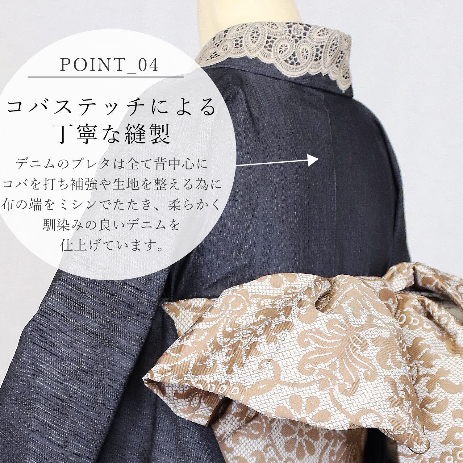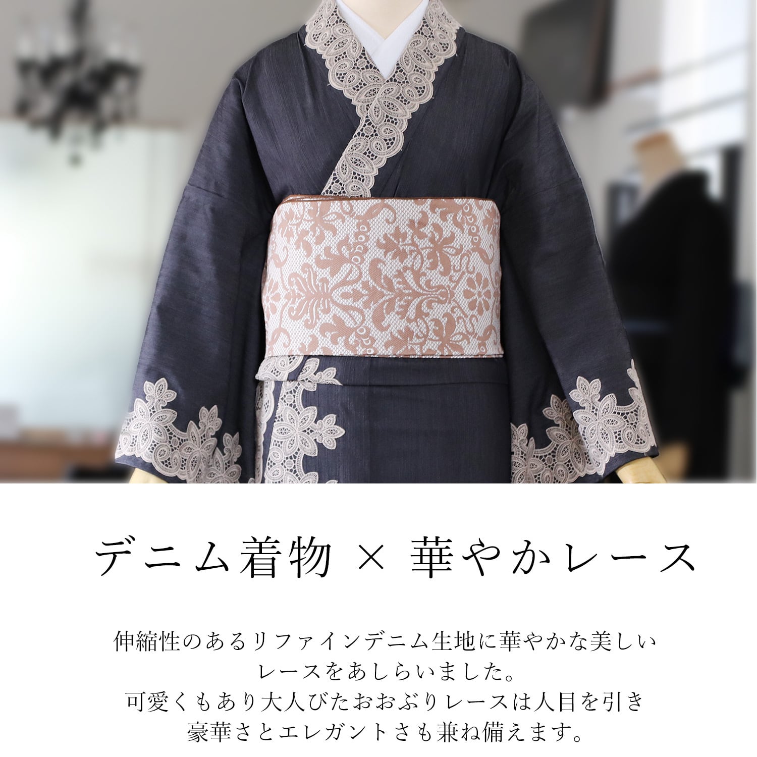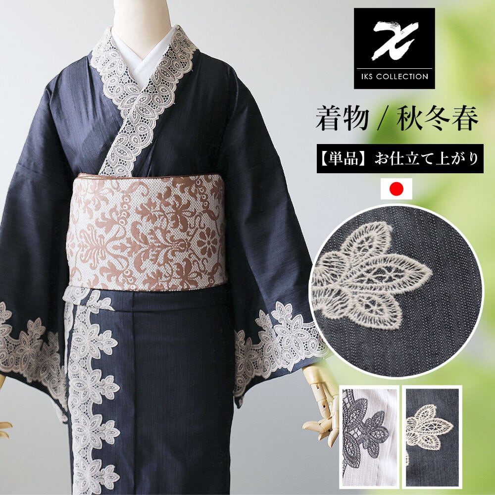 弊社が開発したリファインデニムを使用したレースをまとったお着物。ノーブルデニム着物。デニムの着心地の良さと、カジュアルさ、上品なたたずまいはIKSの真骨頂。伸縮性にとんだ伸びて洗える着物をより洗練された大人女子へお届けします。美しく着物を着こなしたい30代、40代、50代の女性をイメージいたしました。