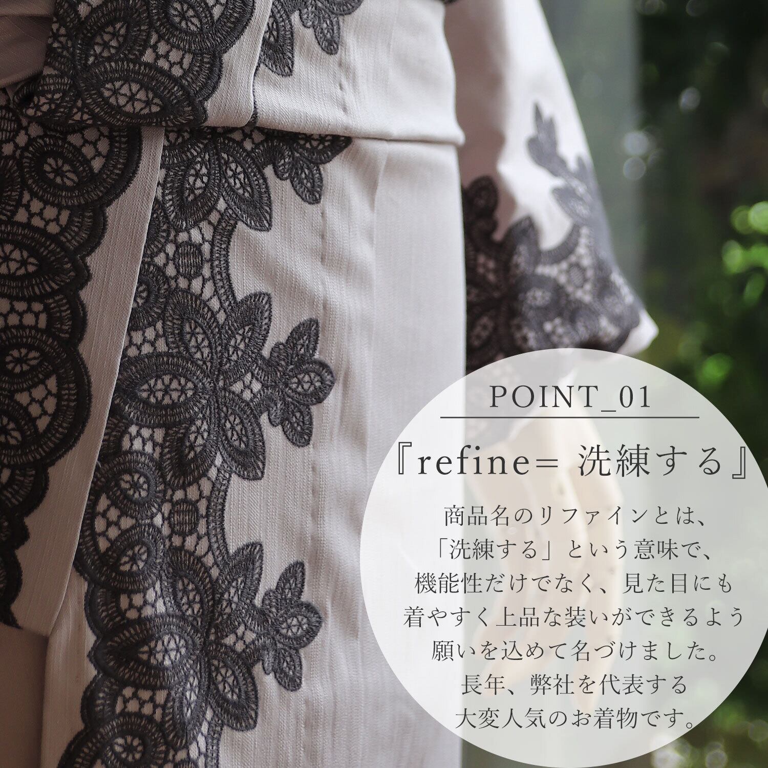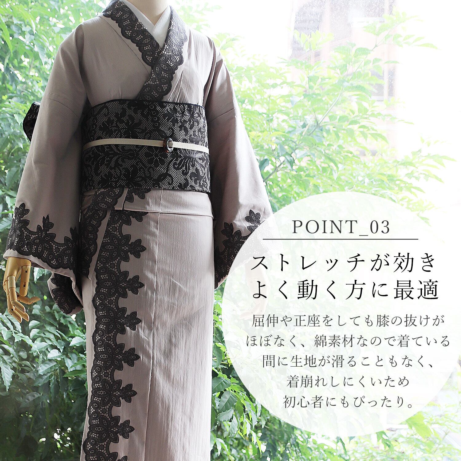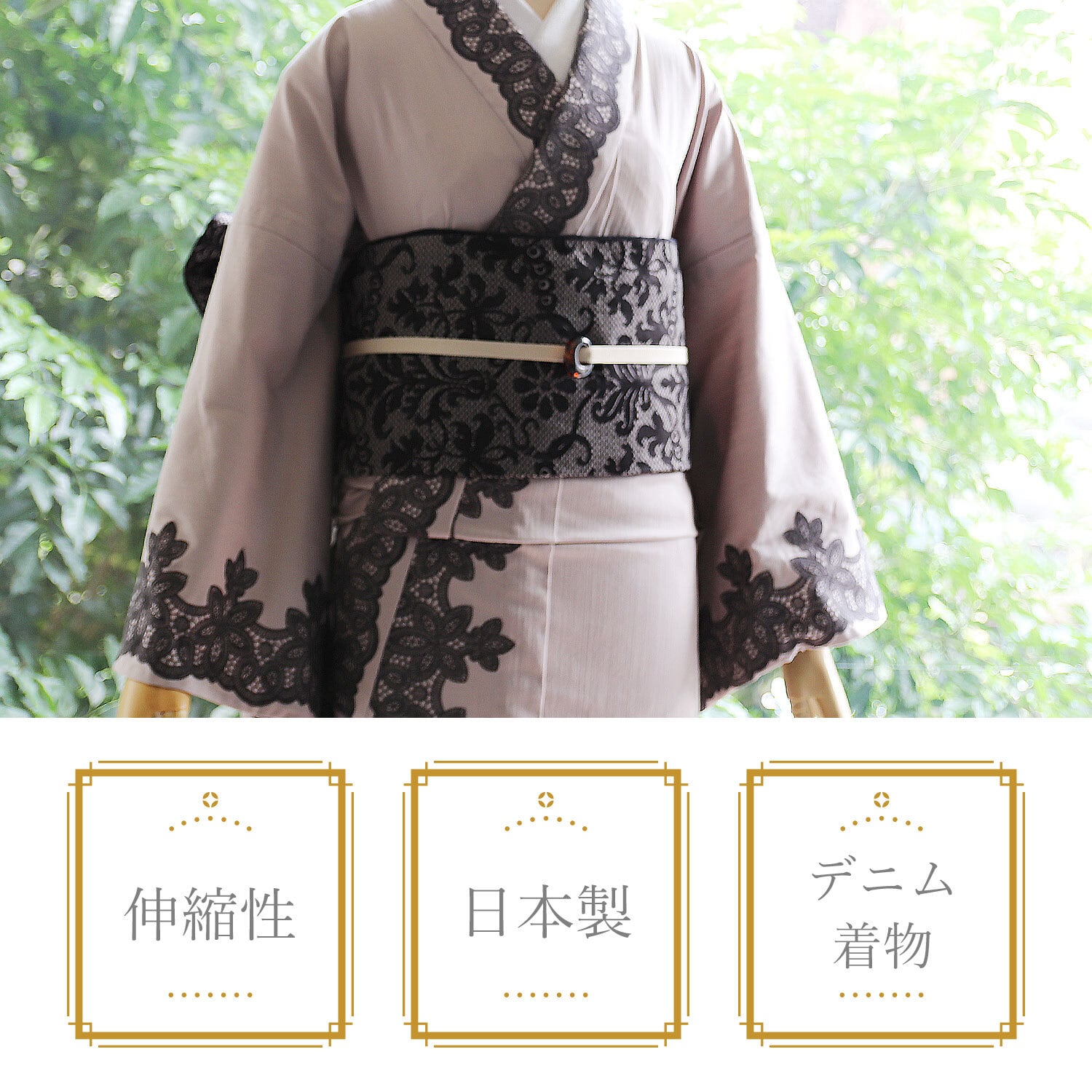 弊社が開発したリファインデニムを使用したレースをまとったお着物。ノーブルデニム着物。デニムの着心地の良さと、カジュアルさ、上品なたたずまいはIKSの真骨頂。伸縮性にとんだ伸びて洗える着物をより洗練された大人女子へお届けします。美しく着物を着こなしたい30代、40代、50代の女性をイメージいたしました。