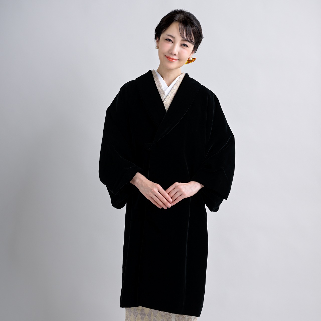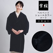 舟底袖の丸みあるショールカラーコート。衿元の緩やかなカーブが小顔に見せストンとしたフォルムのベルベット素材が体系カバーを促してくれます。場面を選ばない冬の定番コートは魅せるゴージャスな気品あるベルベットを。日本製の信頼と実績のあるAgeharaベルベットを使用し、丁寧な縫製で仕上げました。Lサイズのワンサイズ展開。ゆったりと着用可能です。
