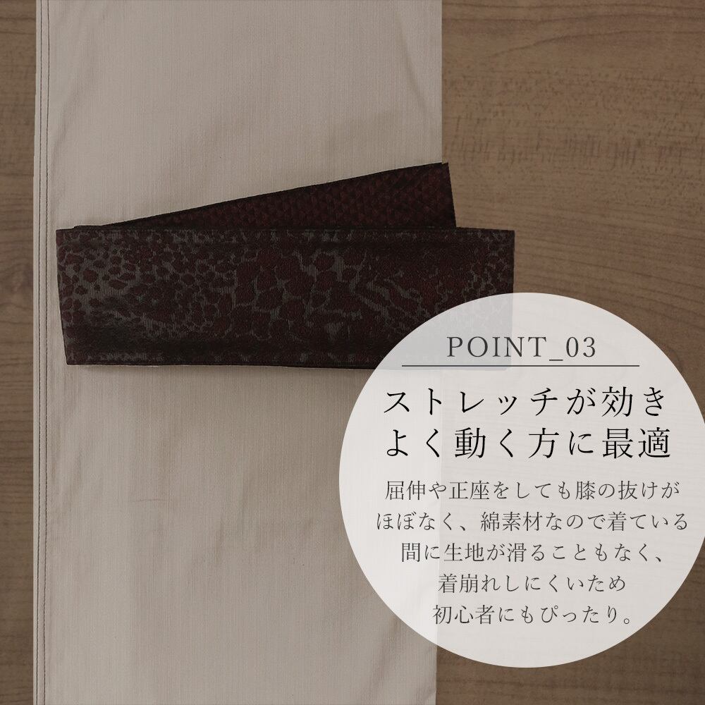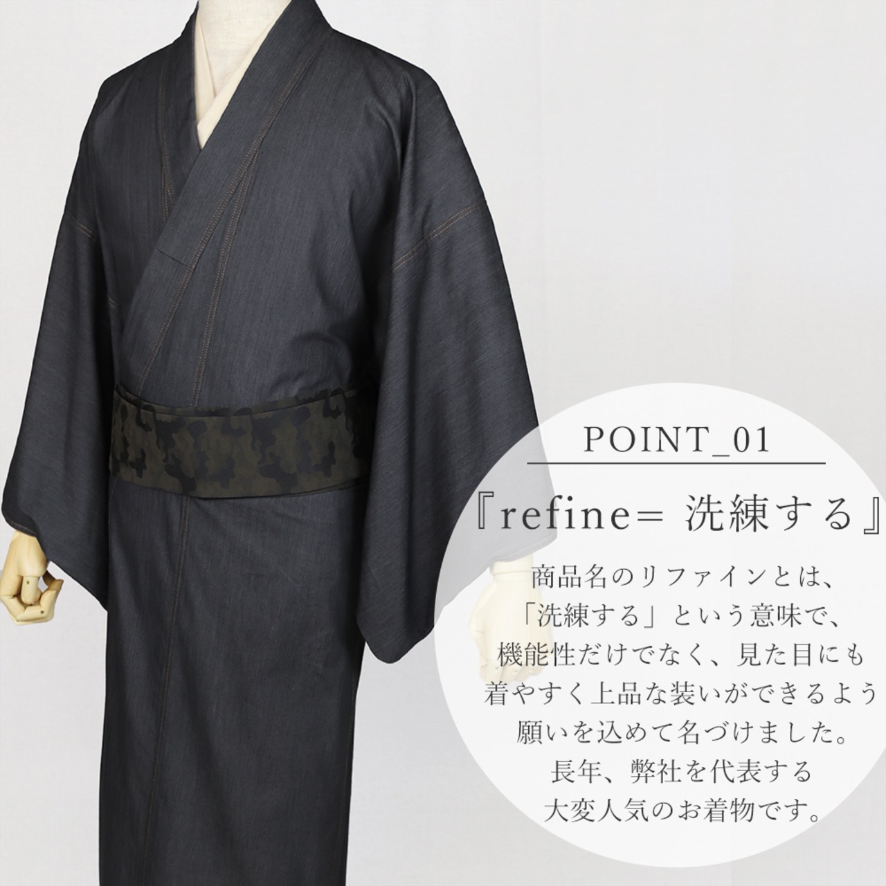 ストレッチ性の『デニム着物』。ストレッチ性のある糸を使う事で、デニム特有の固さやごわつきがなく、動きやすく着心地抜群の生地です。先染めで糸の中までしっかりと浸透させる染めのため、色落ちや色移りがしにくく、いつまでもきれいな色のまま着られる特徴があります。商品名のリファインとは、「洗練する」という意味で、機能性だけでなく、見た目にも着やすく上品な装いができるよう願いを込めて名づけました。