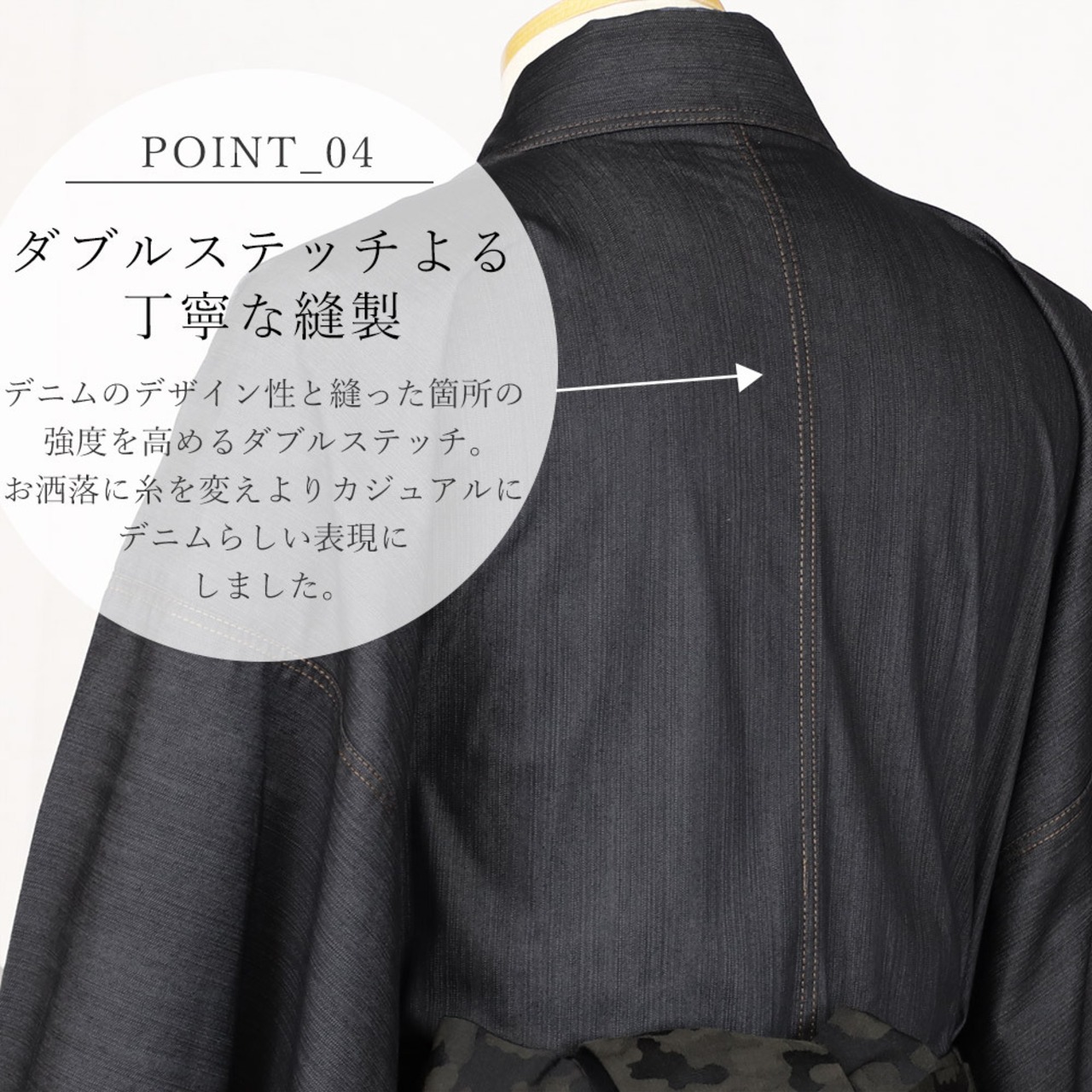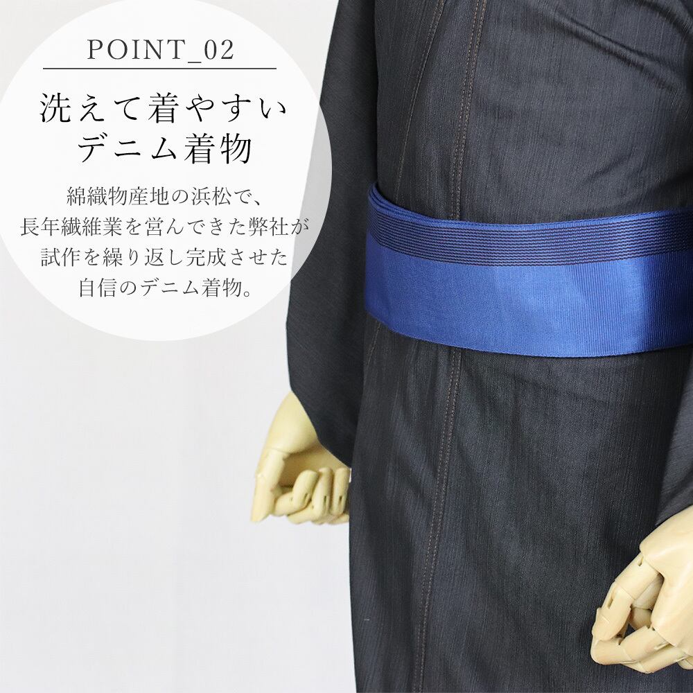 弊社を代表する大変人気のお着物です。綿織物産地の浜松で、長年繊維業を営んできた弊社が試作を繰り返し完成させた自信のデニム着物。デニムのカジュアルな中にもキリっとした着心地の良いリファインデニムをお楽しみください。