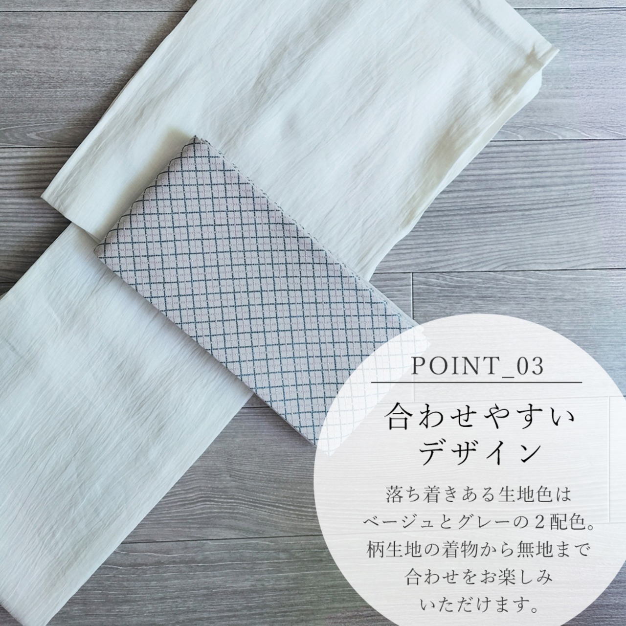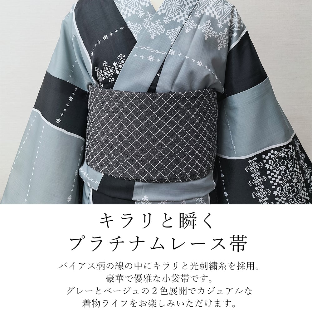 キラリと瞬くプラチナムレース帯。バイアス柄の線の中にキラリと光刺繍糸を採用。豪華で優雅な小袋帯です。グレーとベージュの2色展開でカジュアルな着物ライフをお楽しみいただけます。