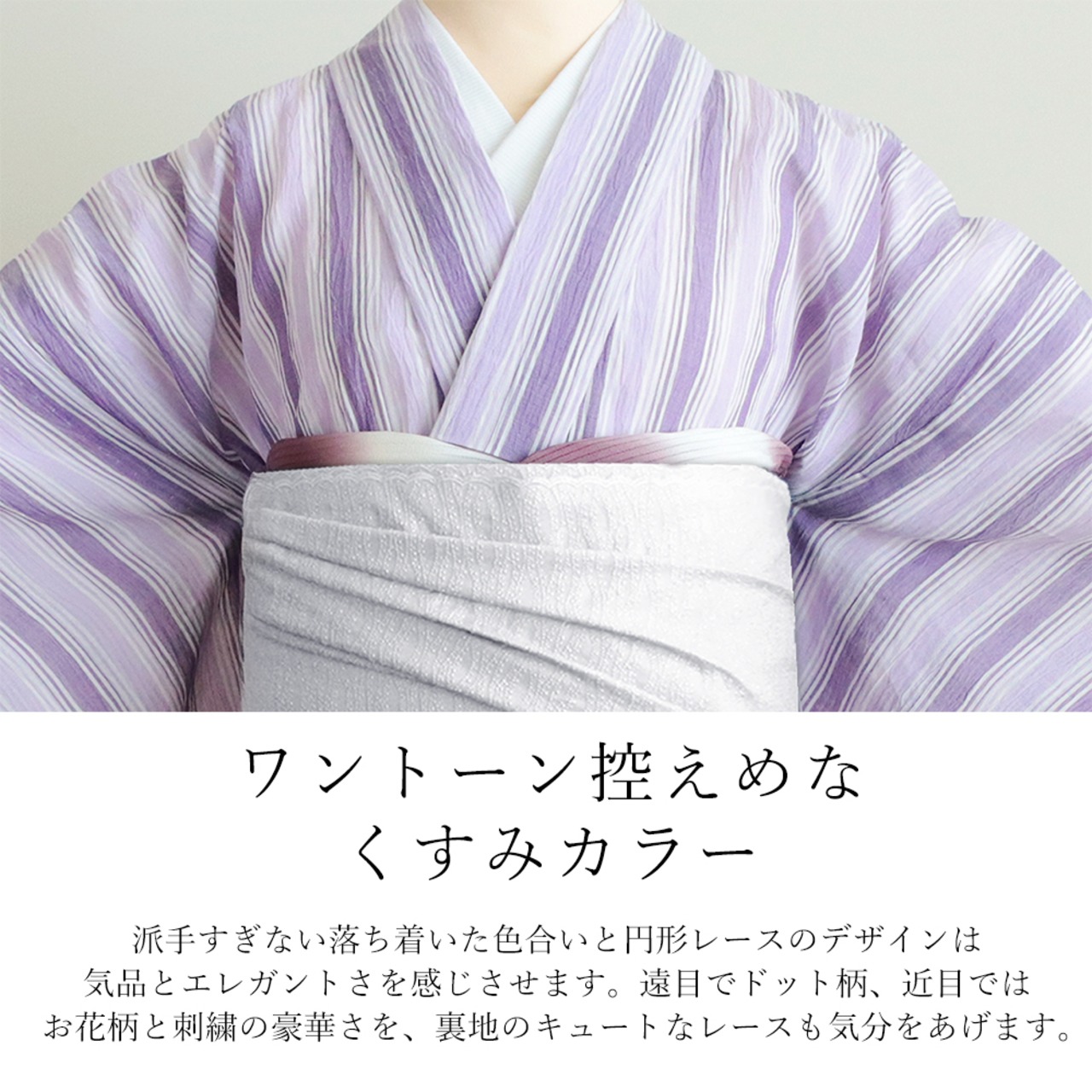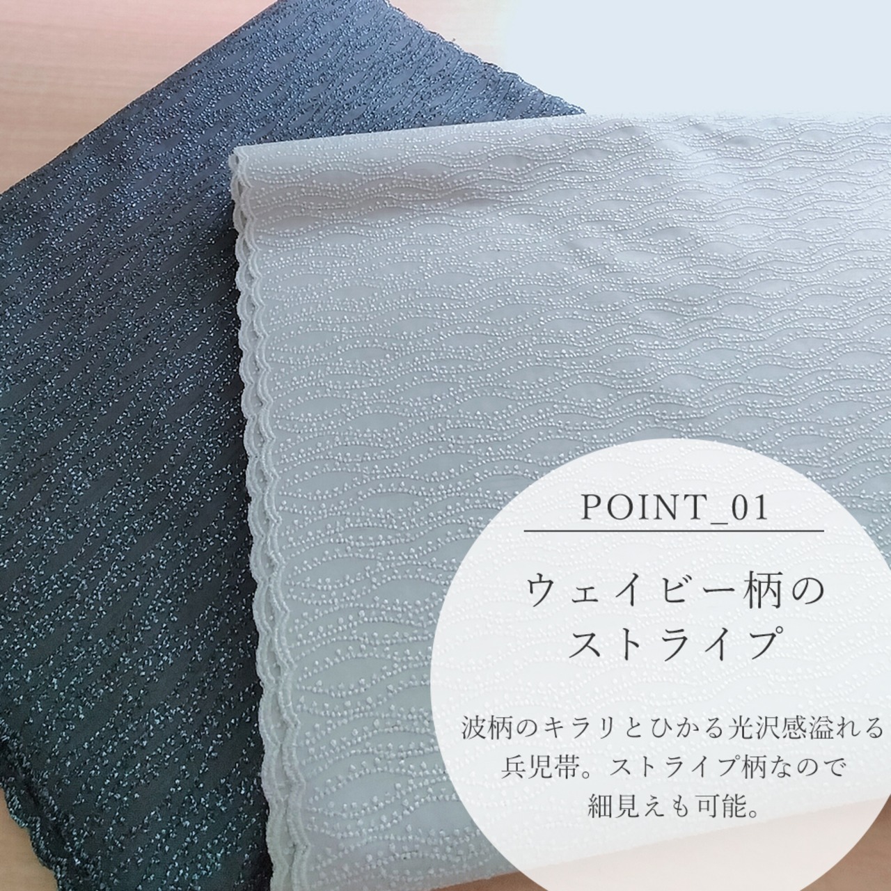 キラリとひかる豪華な印象の兵児帯。ウェイビー柄のストライプは繊細な模様ながらも煌びやかな輝きと上品さを兼ね備えます。巻きやすく爽やかなライトグレー色。着物から浴衣など幅広いカジュアル和装に着用可能。兵児帯の特徴の幅広はトールサイズの女性にも嬉しいサイズ感。腰回りの印象を通常の幅よりお楽しみいただけ、結びも大きく作る事が可能です。貴重な少数生産の為、他の方と被りにくい貴重な1枚となるでしょう。