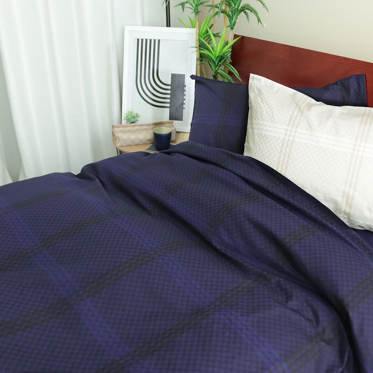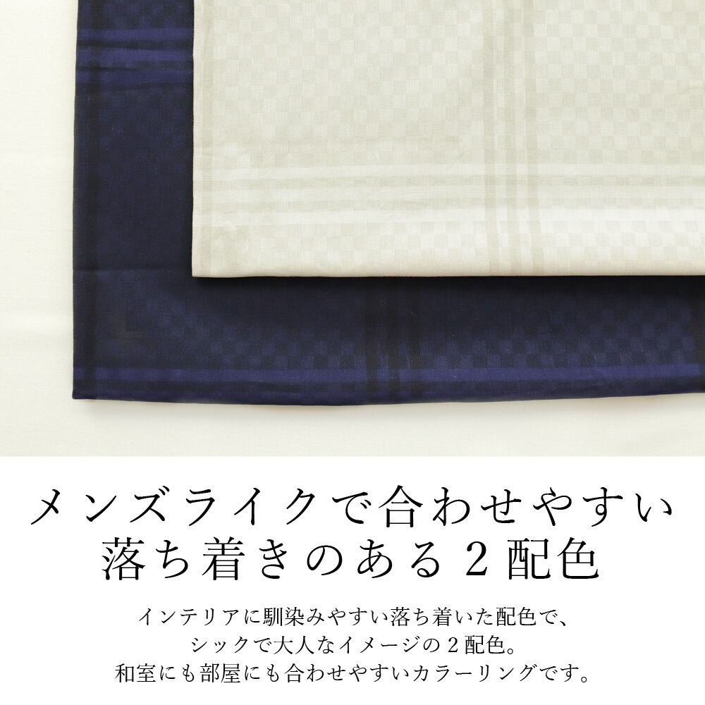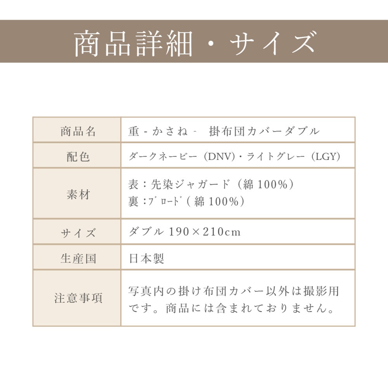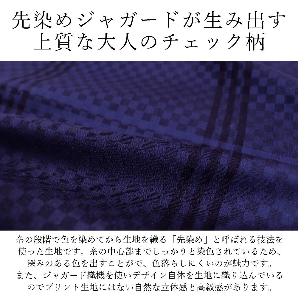 ジャガード織機が織りなすメンズライクなチェック柄。ブロックチェックとウインドウペン、2つのチェック柄を重ねるようにして組み合わせた「重」。同系色でまとめた配色は主張しすぎずメンズライクなインテリアにぴったりです。一見洋室向けの柄ですが、ベースにブロックチェック(市松柄)が織り込まれているので和室にも合わせやすいカバーリングです。裏地部分には抗菌・防臭加工も施されています。また、綿100%素材なので吸湿性と通気性に優れた肌に優しいカバーリングです。