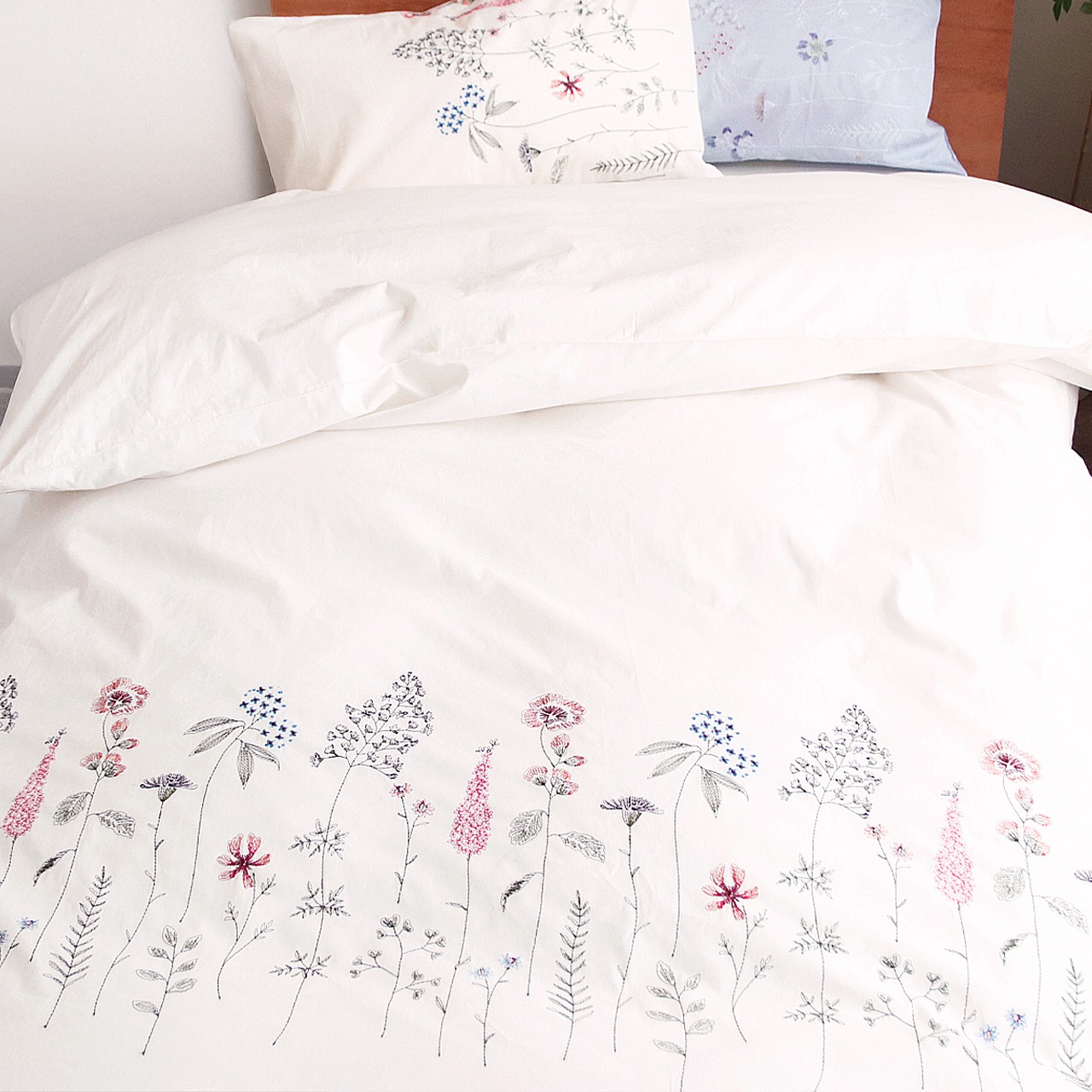 ローマ神話の花と春の女神である『フローラ』をイメージしたベッドリネン。強度と耐久性のある上質なブロード生地に女性らしい華やかな花柄を刺繍しました。ナチュラルなホワイトと上品なブルー配色でお部屋にやわらかさをプラスしてくれます。ベースの生地には天然素材である綿を100%使用し肌に優しいのもうれしいポイントです。
