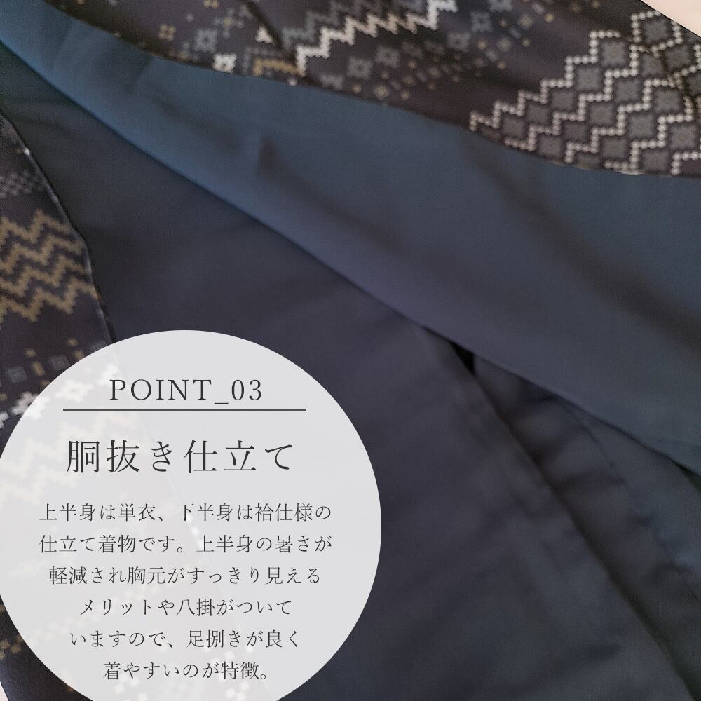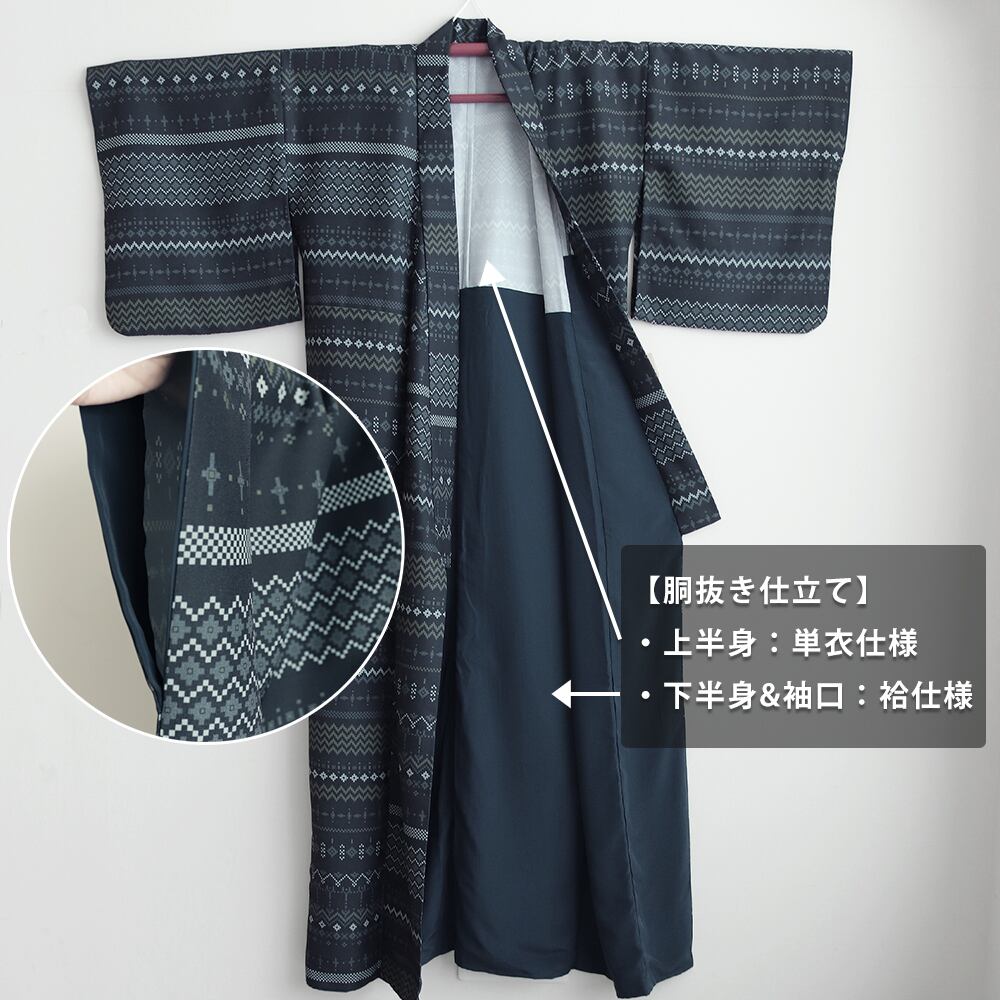 裏地ある「袷仕立て」の上半身のみ単衣仕様の仕立て方。上半身部分のみ単衣で下半身のみ袷仕様になっています。上半身の暑さが軽減され胸元がすっきり見えるメリットや八掛がついていますので、足捌きがよく着やすい為、夏冬関係なく胴抜き仕立てのお着物を着用される方が増えています。