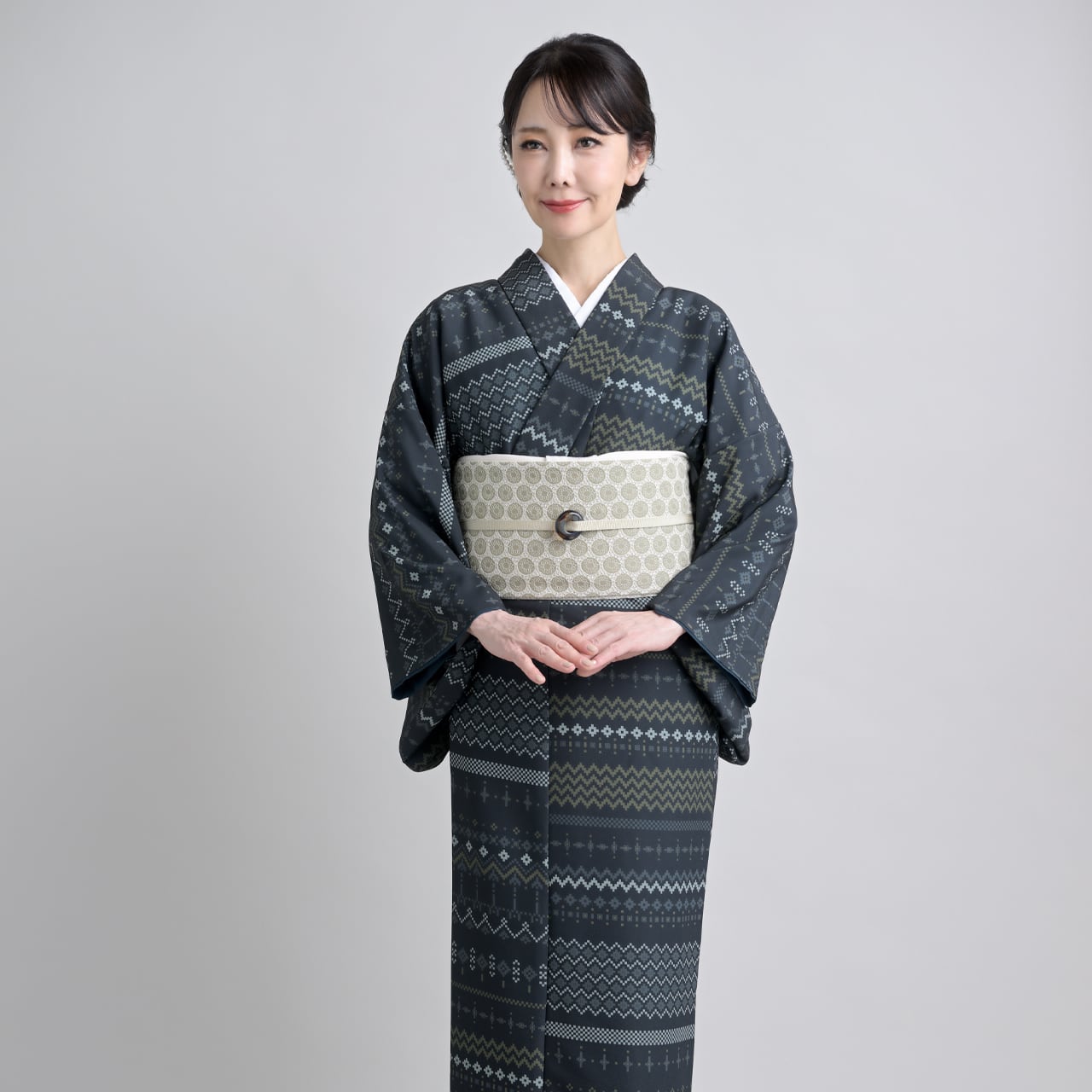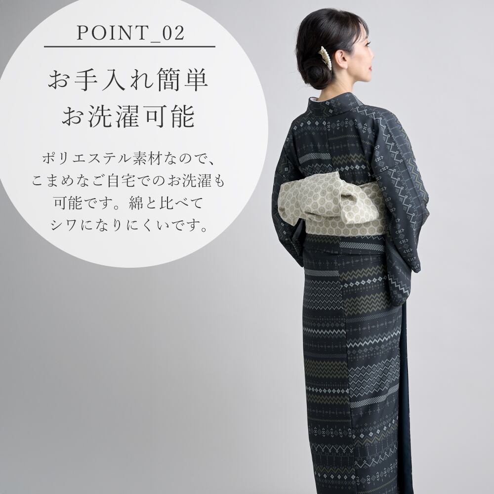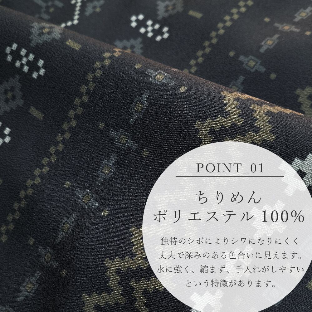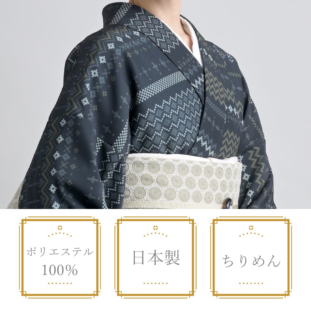 滑らかな見た目と触り心地が特徴のちりめん。表面に凹凸(シボ)がある織物「ちりめん」は、耐久性や扱いやすさがあり、お洗濯も可能でシワになりにくく袷仕様なので3シーズン着用可能です。墨色よりの黒色地にグリーンのノルディック柄が落ち着きと上品さをアップしてくれ、落ち着いたデザインの中にも上質感を感じさせる一着です。