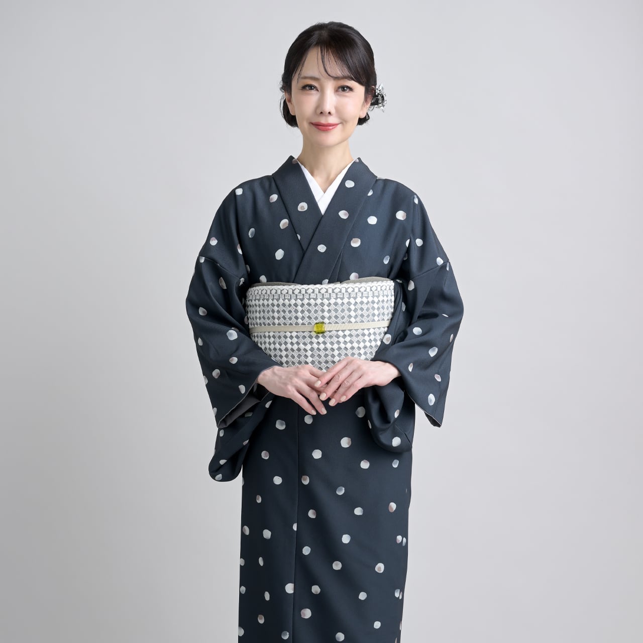 滑らかな見た目と触り心地が特徴のちりめん。表面に凹凸(シボ)がある織物「ちりめん」は、耐久性や扱いやすさがあり、お洗濯も可能でシワになりにくく袷仕様なので3シーズン着用可能です。墨色よりの黒色地に不揃いのドット柄が落ち着きと上品さをアップしてくれ、落ち着いたデザインの中にも上質感を感じさせる一着です。
