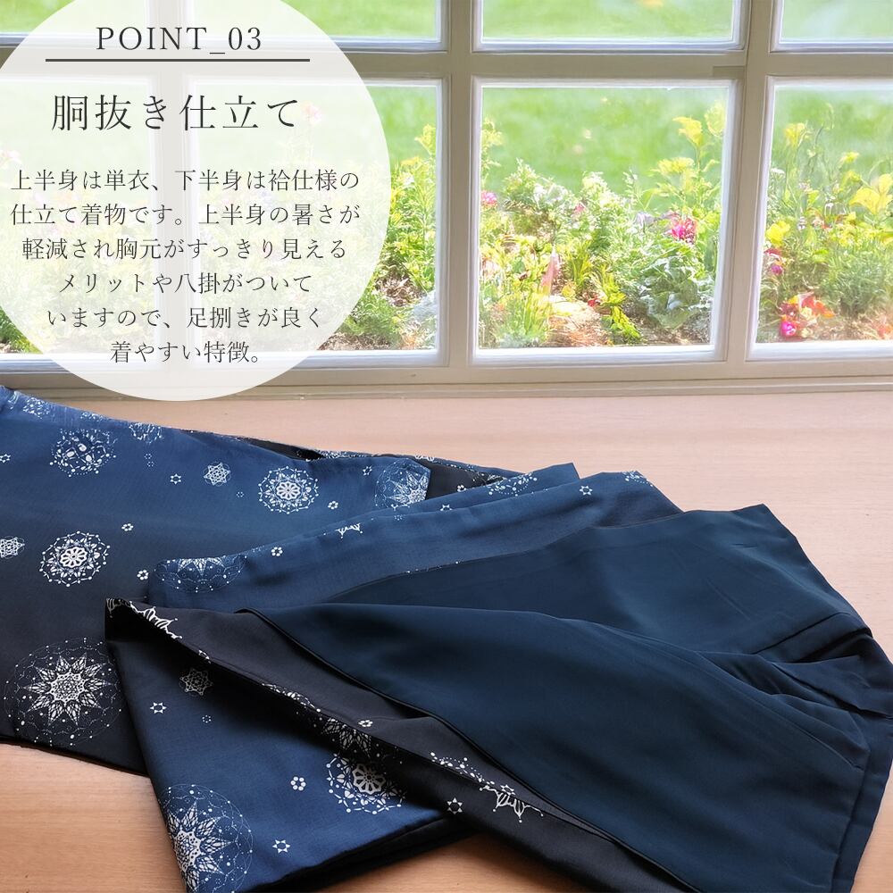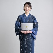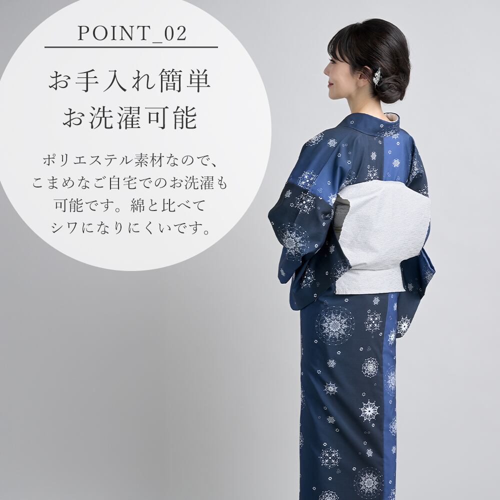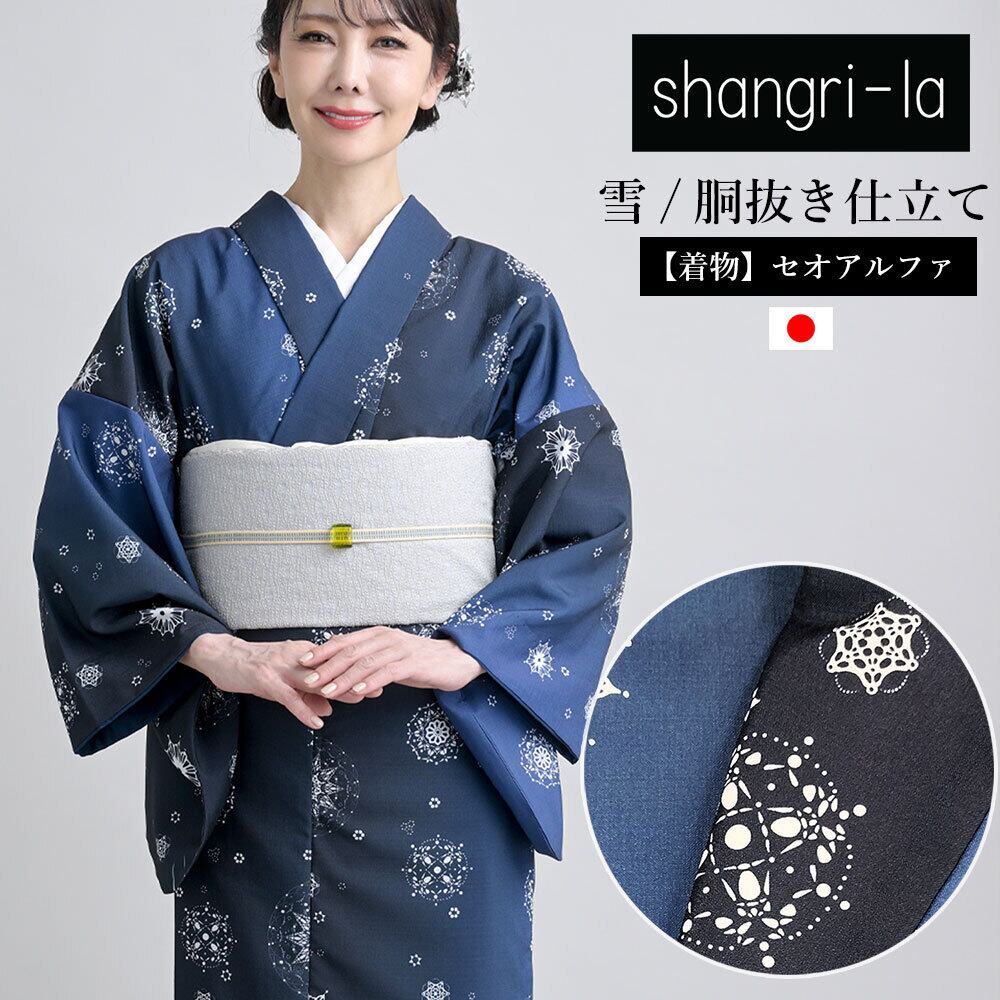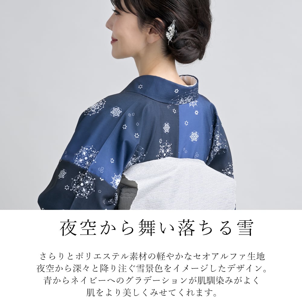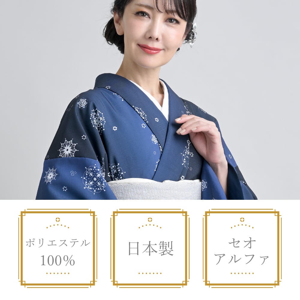 セロα ブッチャー素材の雪柄の着物。冬の美しい雪景色をイメージした一枚です。軽やかなセロα素材を使用し、足さばきも軽快で心地よい肌触りと優れた通気性を実現しました。さらりとした素材のセオアルファは、シワになりにくく、お洗濯も可能な着物として万能素材です。歩く度にテロンテロンとしたニュアンスのお着物なので、締め付け感もなく着やすく窮屈感を感じさせません。フリーサイズなので、さまざまな体型の方にフィットし、自由な着こなしが楽しめます。
