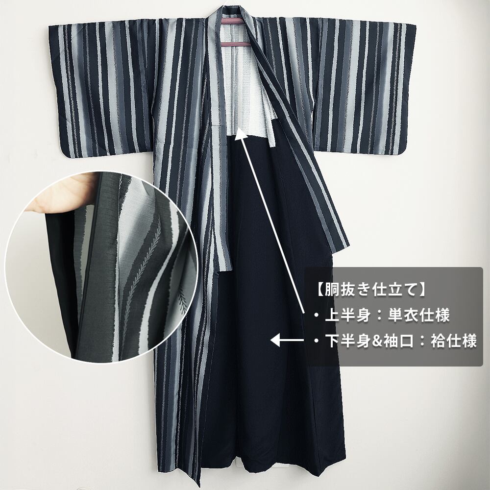 裏地ある「袷仕立て」の上半身のみ単衣仕様の仕立て方。上半身部分のみ単衣で下半身のみ袷仕様になっています。上半身の暑さが軽減され胸元がすっきり見えるメリットや八掛がついていますので、足捌きがよく着やすい為、夏冬関係なく胴抜き仕立てのお着物を着用される方が増えています。