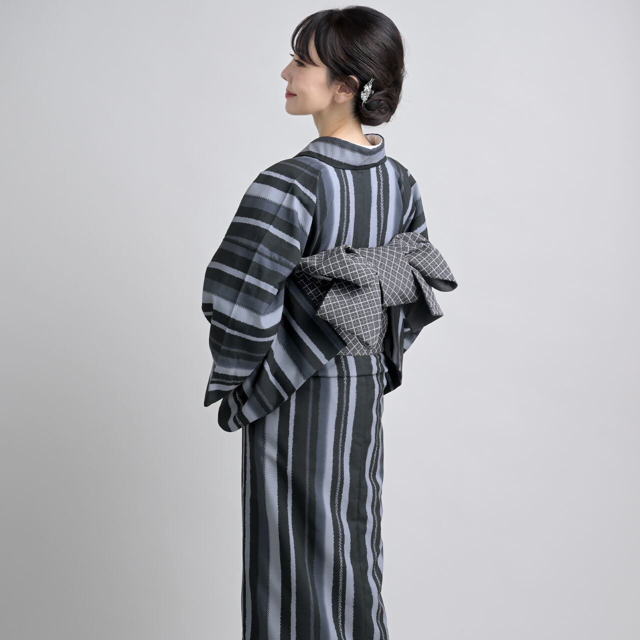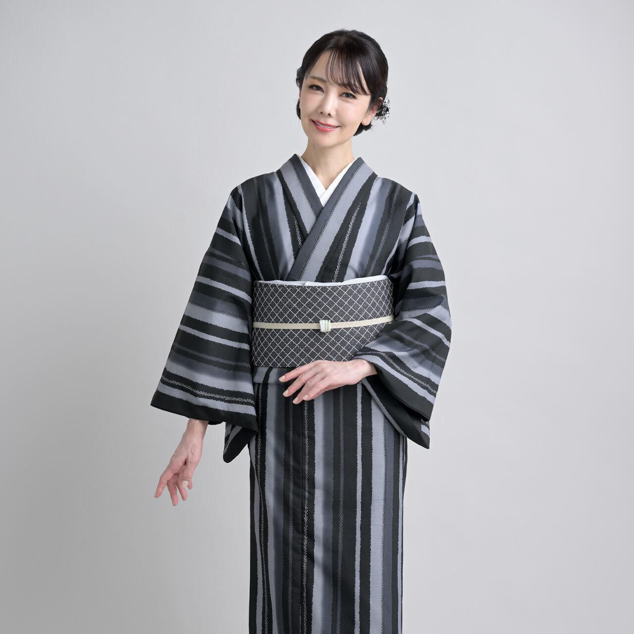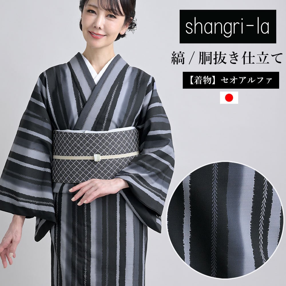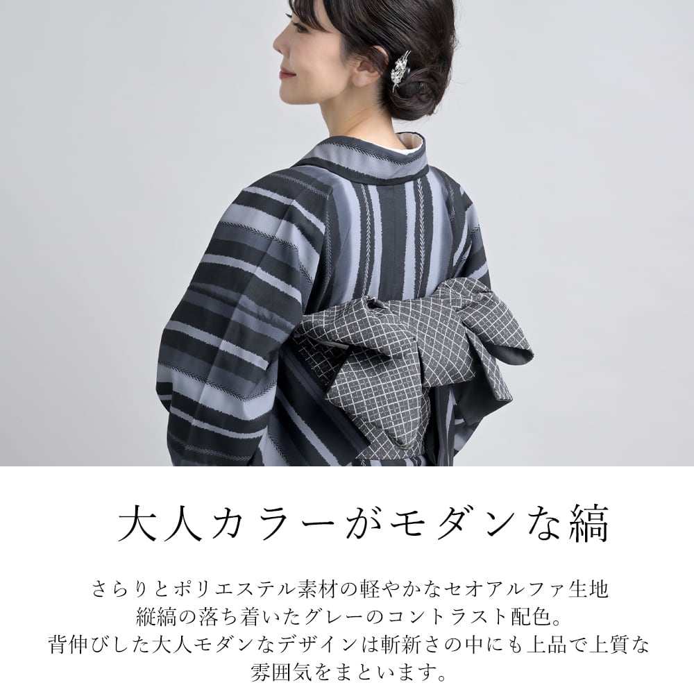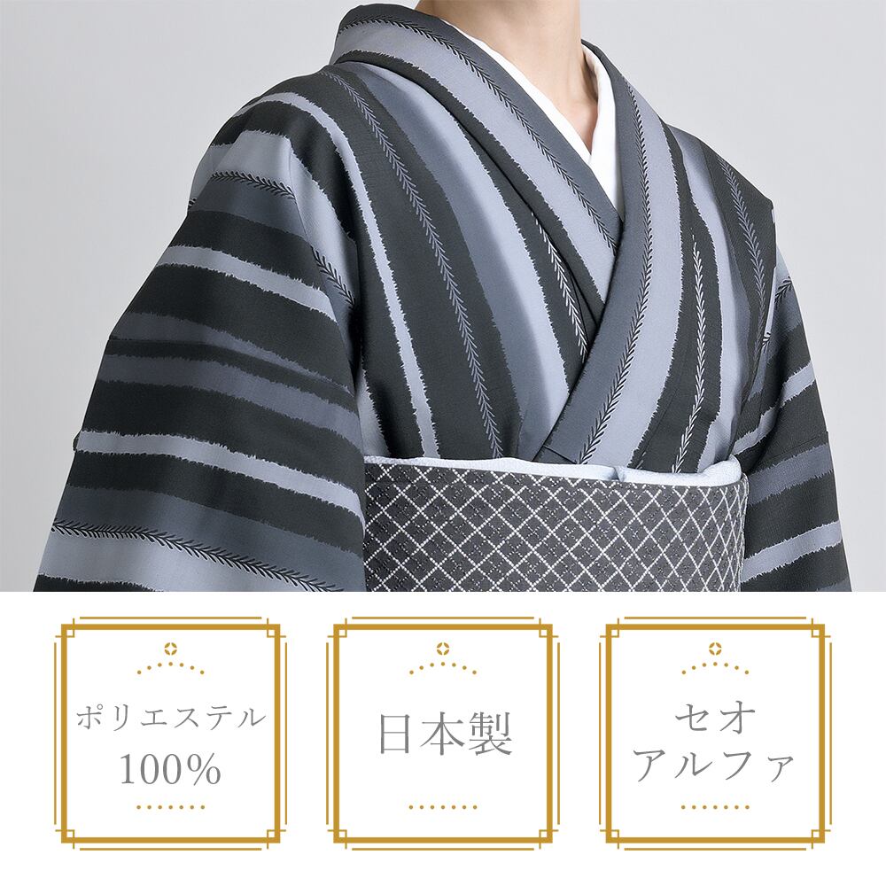 セロα ブッチャー素材のストライプの縞柄着物。軽やかなセロα素材を使用し、足さばきも軽快で心地よい肌触りと優れた通気性を実現しました。さらりとした素材のセオアルファは、シワになりにくく、お洗濯も可能な着物として万能素材です。歩く度にテロンテロンとしたニュアンスのお着物なので、締め付け感もなく着やすく窮屈感を感じさせません。変わりストライプ柄の縦縞模様は、体形をスラリと細身&長身に見える効果もあり、スタイル抜群な着こなしを期待したい。フリーサイズなので、さまざまな体型の方にフィットし、自由な着こなしが楽しめます。