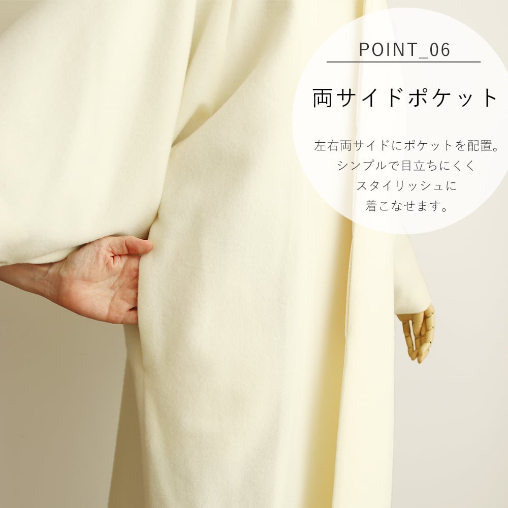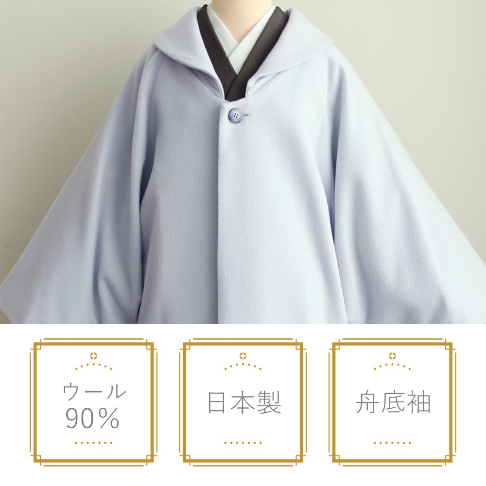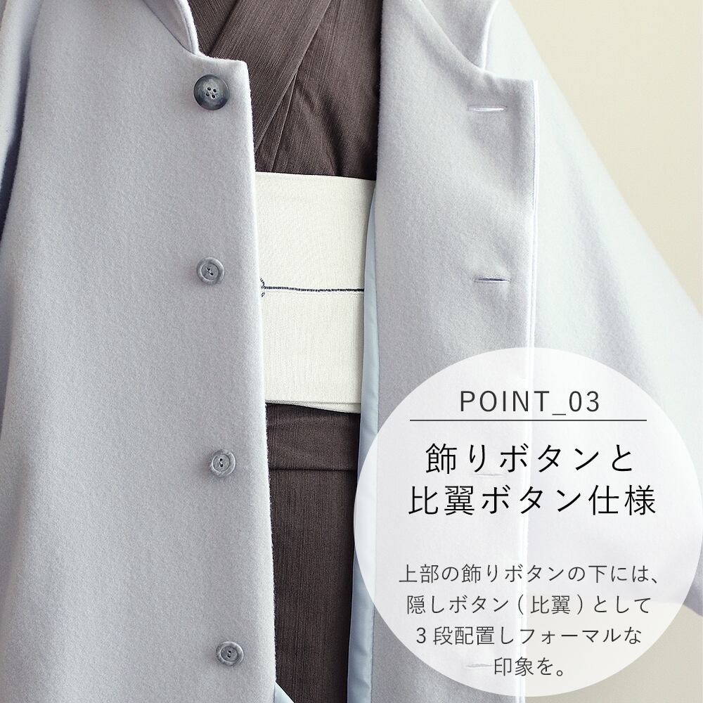 ウールフラノとは、紡毛糸を縮絨や起毛といった加工で仕上げたふくらみのある肉厚な生地です。保温性に優れ柔らかさと弾力があり、肌触りが良く起毛によって柔らかい風合いが生まれる生地を採用。また、エレガントで上品なショールカラーは大人可愛い雰囲気を醸し出してくれます。お出かけ時でも、シワになりにくく型崩れしにくいという特徴があります。寒い季節にぴったりのこちらのコートは、舟底袖となっており舟底に似た形状で袖口が狭いので邪魔にならず動きやすいです。着物袖を上手にしまい込んで、外出時のかさばりや動きを楽にしてくれる上品でエレガントな機能的な着物コートです。素材とデザインと機能性を兼ね備えた唯一無二のコート。