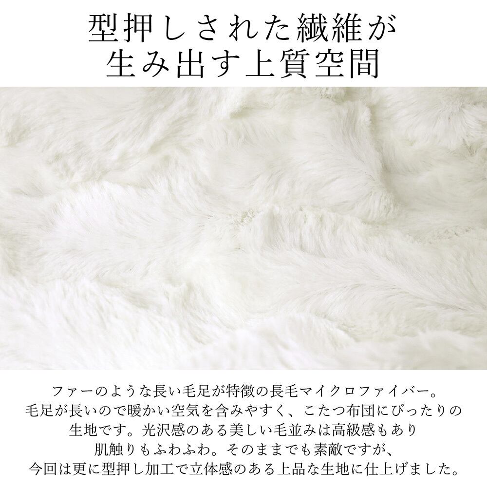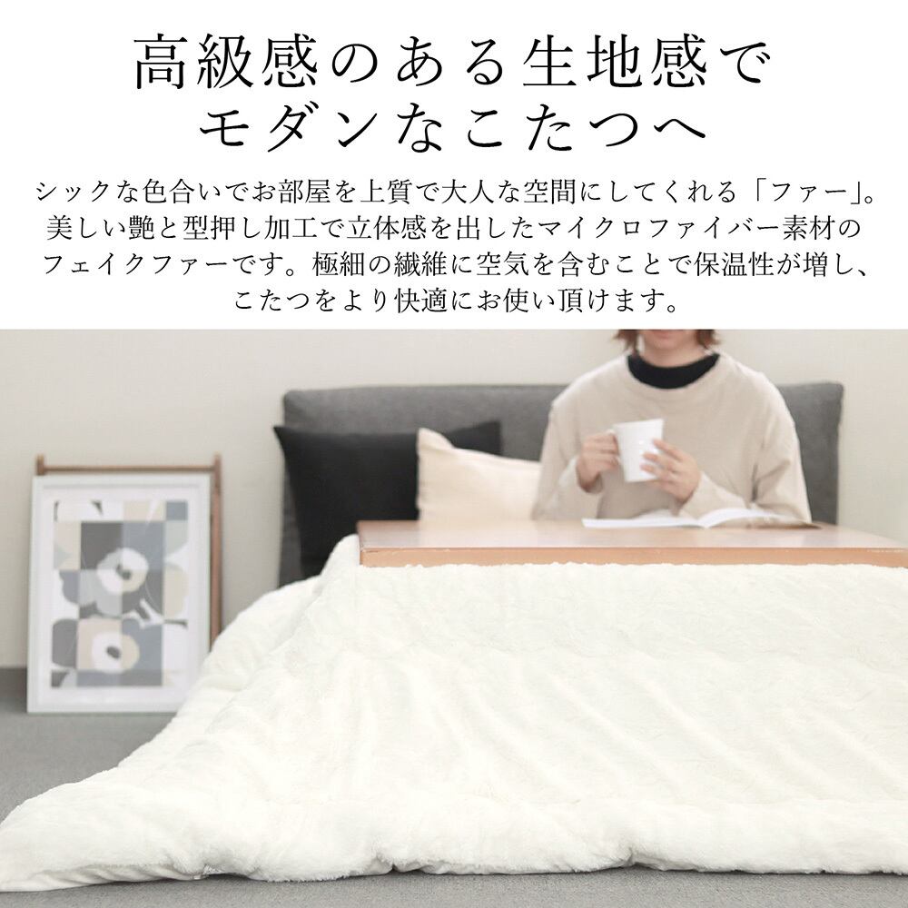 シックな色合いでお部屋を上質で大人な空間にしてくれる「ファー」。美しいツヤと型押し加工で立体感を出したマイクロファイバー素材のフェイクファーです。ポコポコデザインだと可愛すぎちゃう大人女子の為の、高級感溢れるこたつ布団。上品なグレーとアイ彫りの2色展開で、在庫処分の為、75%offにてご提供させていただきます。