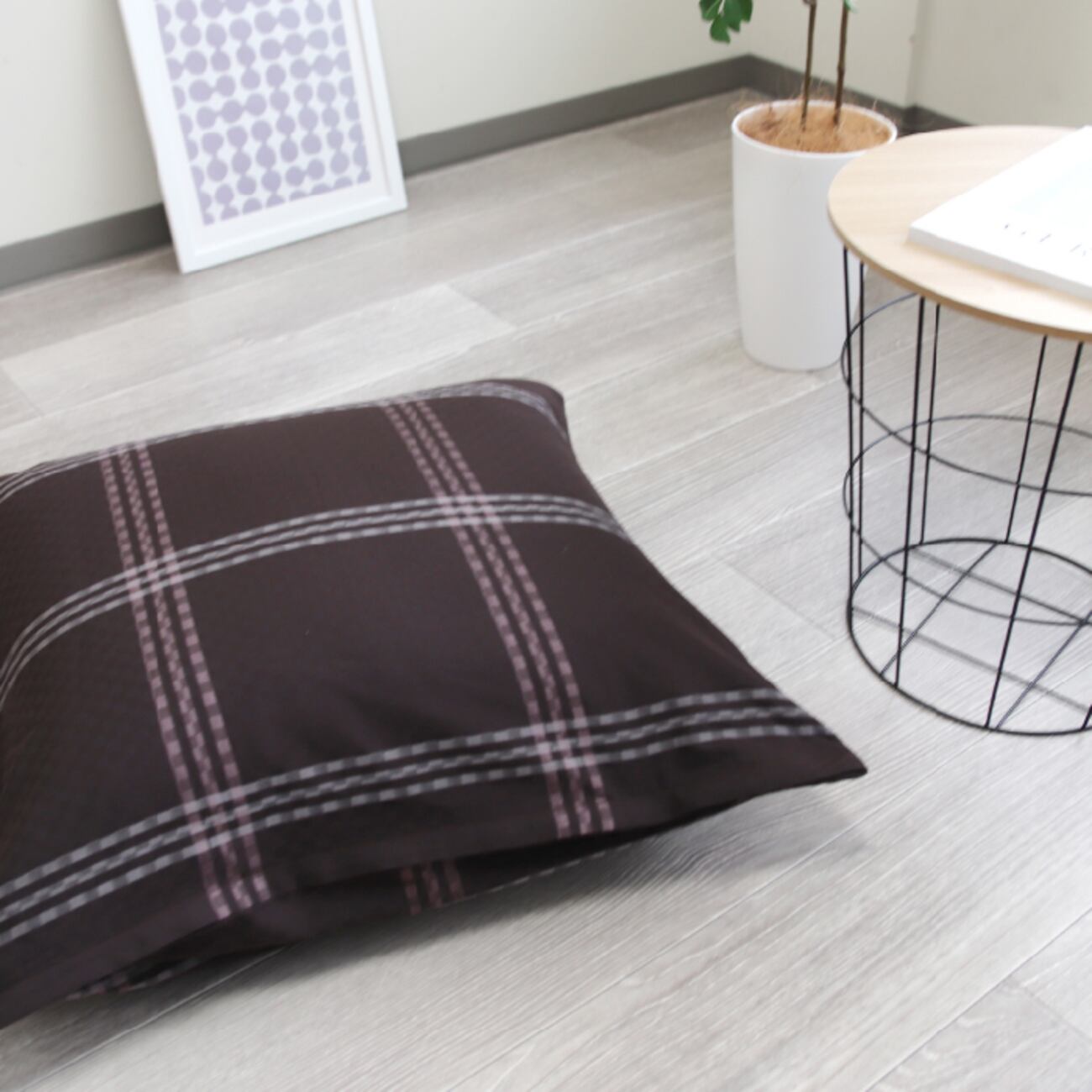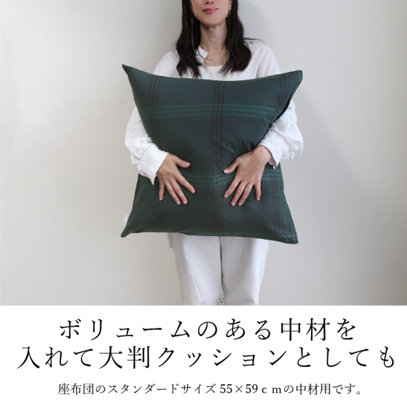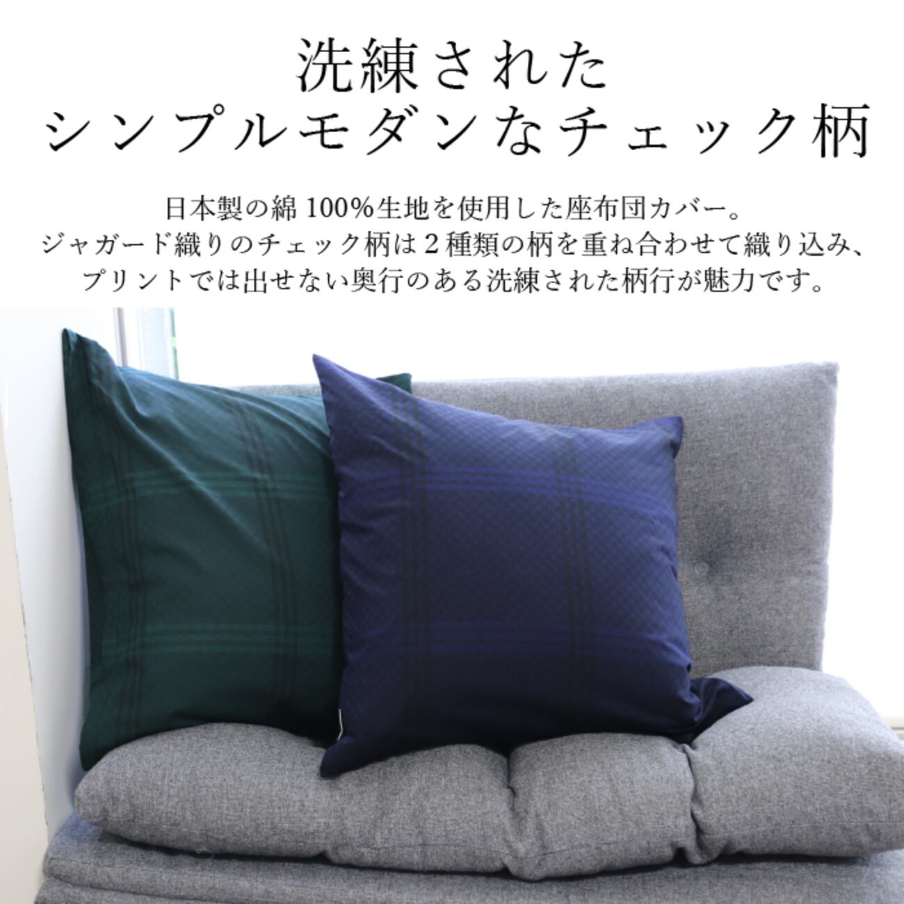 この座布団カバーは、モダンでおしゃれなデザインが魅力です。ジャガード織りのチェック柄が高級感を演出し、ダークグリーン、ダークブラウン、ダークネイビーの3色展開でお部屋の雰囲気に合わせて選べます。綿100%の素材は肌触りが良く、快適な座り心地を提供します。日本製の品質で、ホテルライクな空間を演出するのにぴったりです。大判サイズなので、ゆったりとしたくつろぎの時間を楽しめますよ。