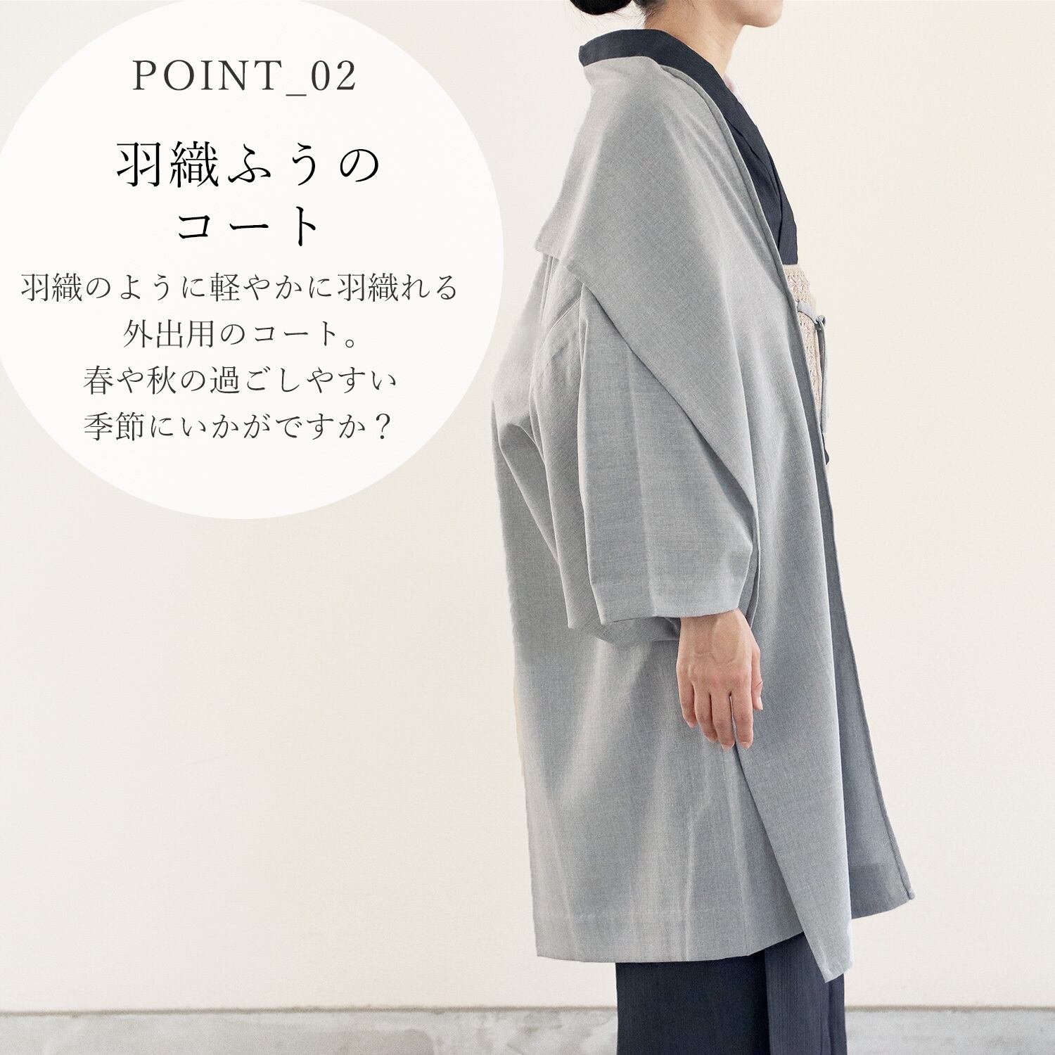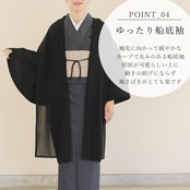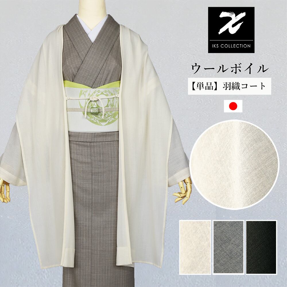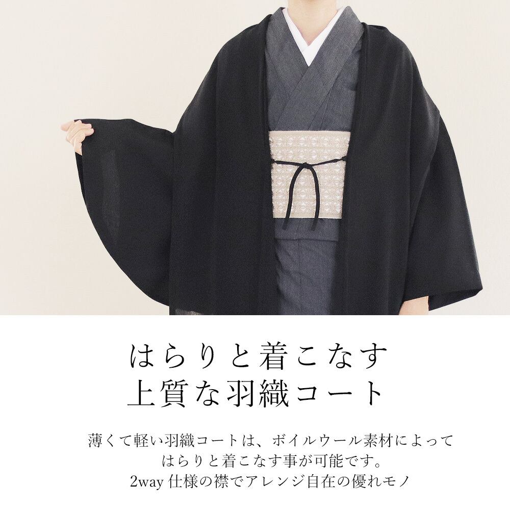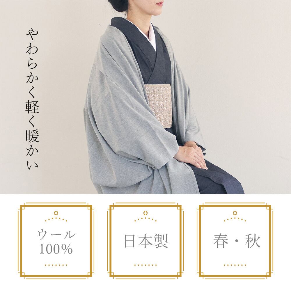 さらりとなめらかな肌触り。エアリーなふわっとしたシンプル無地の羽織コート。どんな柄の帯やお着物でも落ち着いた雰囲気にさせてくれます。ボイルウールの特徴でもある、柔らかくて軽くて暖かい。薄手の生地ですがウール100%のエアリーな羽織です。ボイルというフランス語は、結婚式でも使われるベールという意味。薄く透け感が素敵です。また和装にも洋装にもマッチするので、幅広くお手持ちのファッションに使えます。独特の船底袖は、洋装のドルマリン袖にも嬉しい。通気性が良く、強いコシのあるウールボイルの羽織コート。さらっとした上質感をお楽しみください。