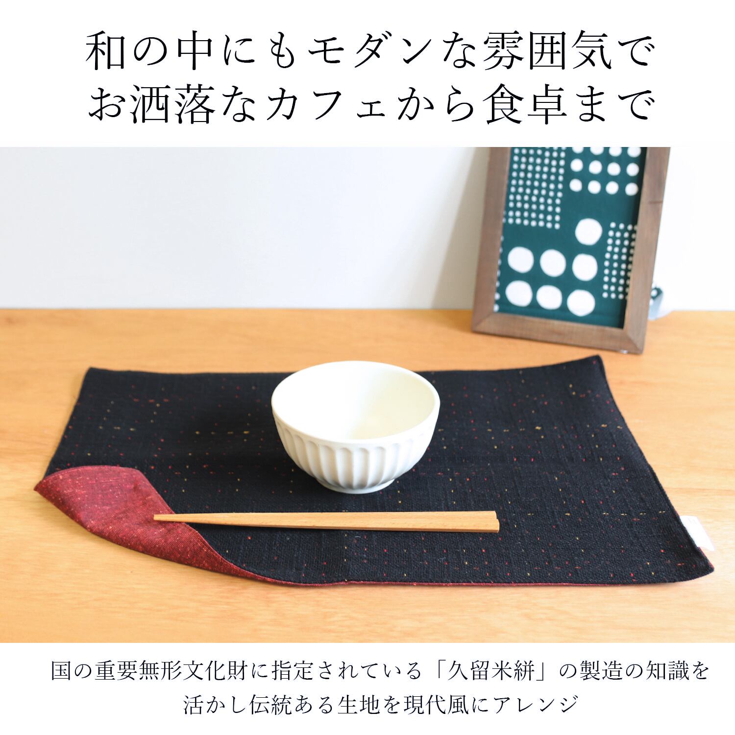 このランチョンマットは、伝統的な久留米織りの高級生地を使用し、和風の美しさとモダンなデザインを兼ね備えています。リバーシブル仕様で、両面を楽しめるのが魅力的。綿100%の素材は、手触りが良く、使うたびに心地よさを感じられます。飲食店や宿泊施設でも採用されているので、品質はお墨付き。日常の食卓をちょっと特別に演出してくれますよ。