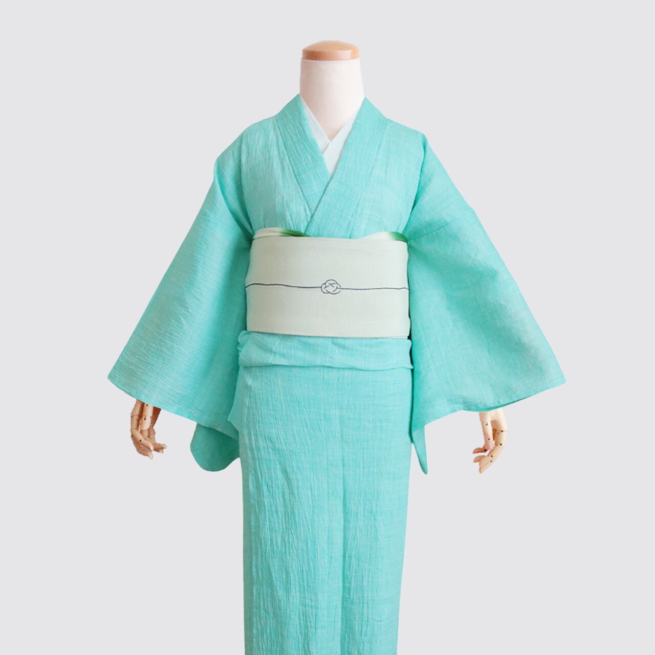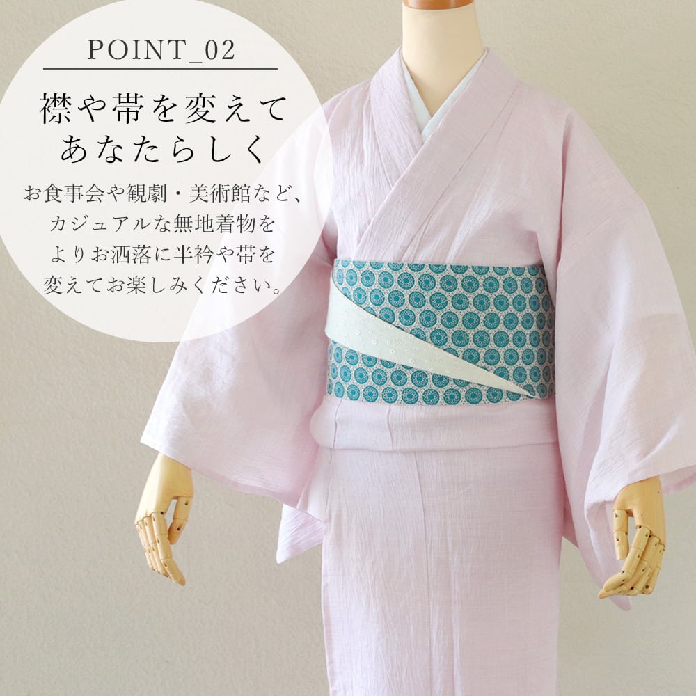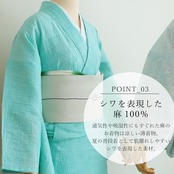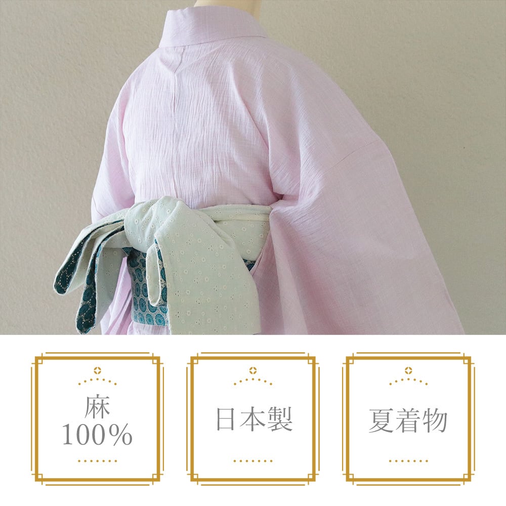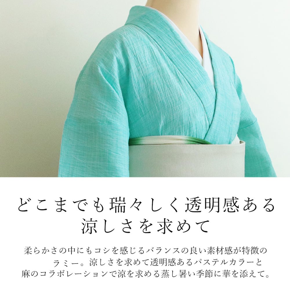 どこまでも瑞々しく透明感ある涼しさを求めて。柔らかさの中にもコシを感じるバランスの良い素材感が特徴の麻。透明感あるパステルカラーと麻のコラボレーションで涼しさを求める蒸し暑い季節に華を添えて。夏着物をより楽しんでいただく為に、帯や衿を変えて無地のお着物をお楽しみいただけたらと思います。あなたらしく艶やかに、シワを表現した通気性の良い麻100%の夏着物です。