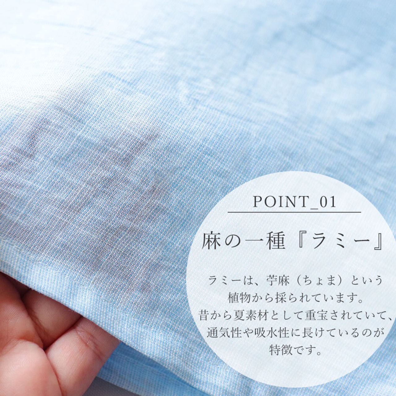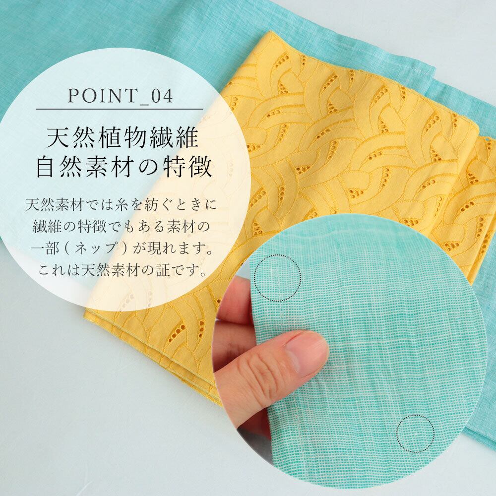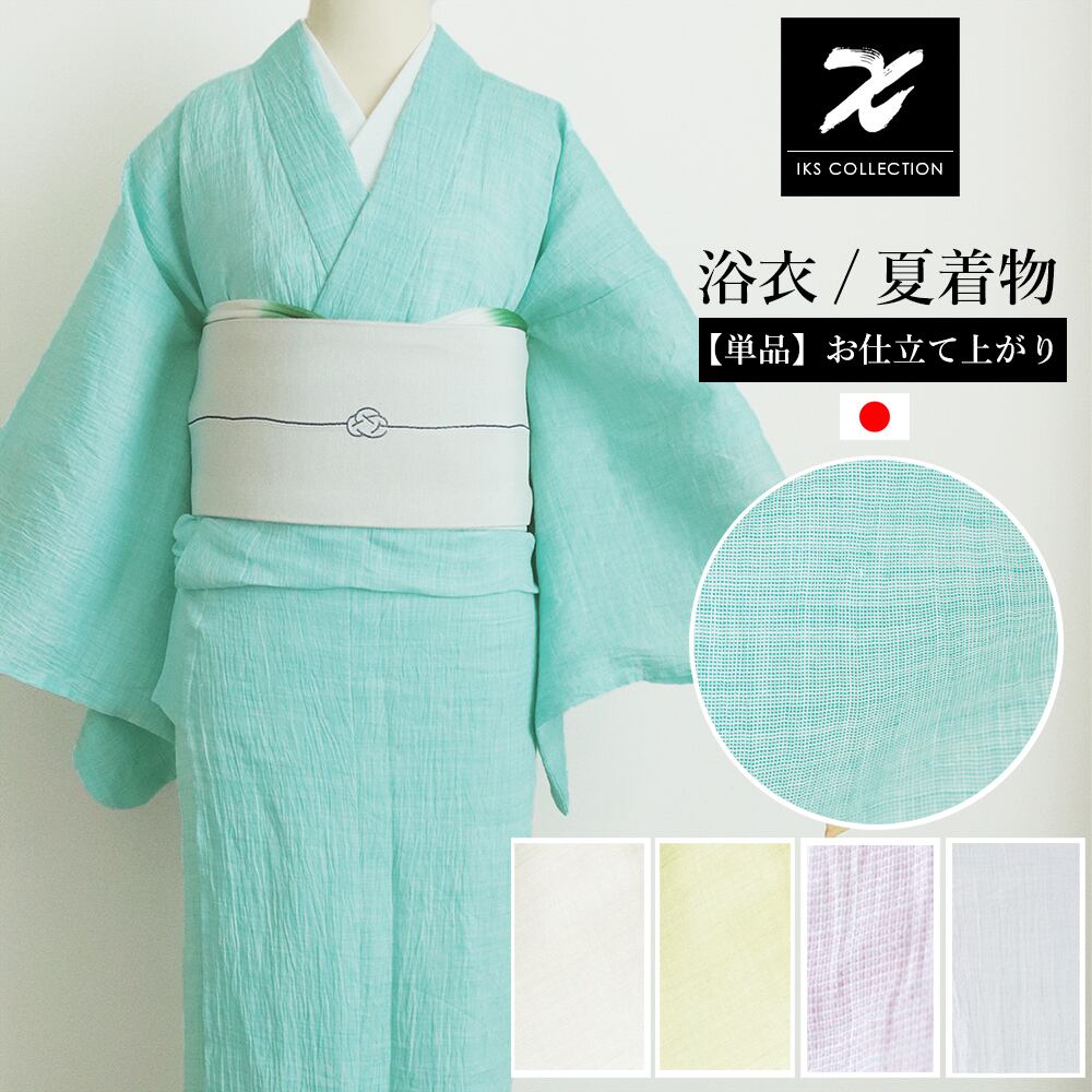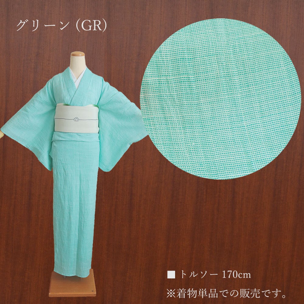 どこまでも瑞々しく透明感ある涼しさを求めて。柔らかさの中にもコシを感じるバランスの良い素材感が特徴の麻。透明感あるパステルカラーと麻のコラボレーションで涼しさを求める蒸し暑い季節に華を添えて。夏着物をより楽しんでいただく為に、帯や衿を変えて無地のお着物をお楽しみいただけたらと思います。あなたらしく艶やかに、シワを表現した通気性の良い麻100%の夏着物です。