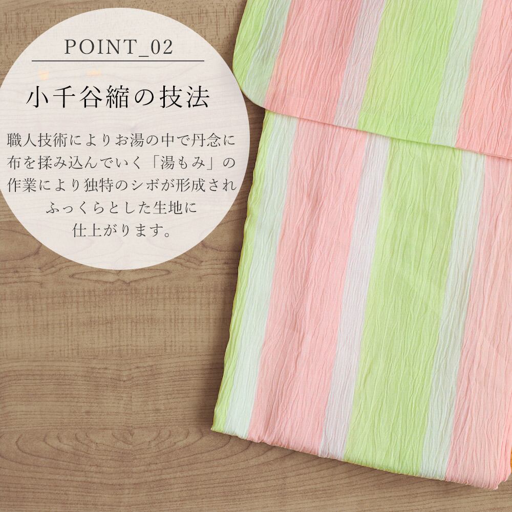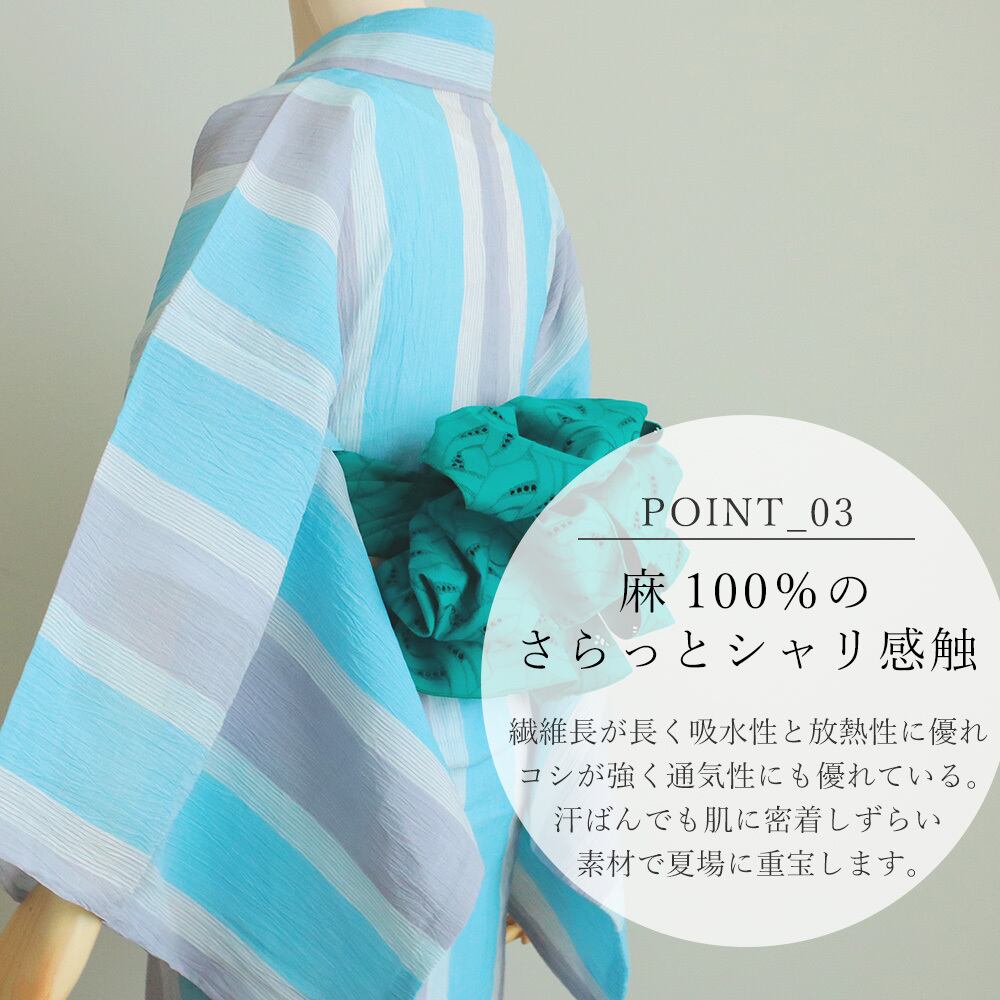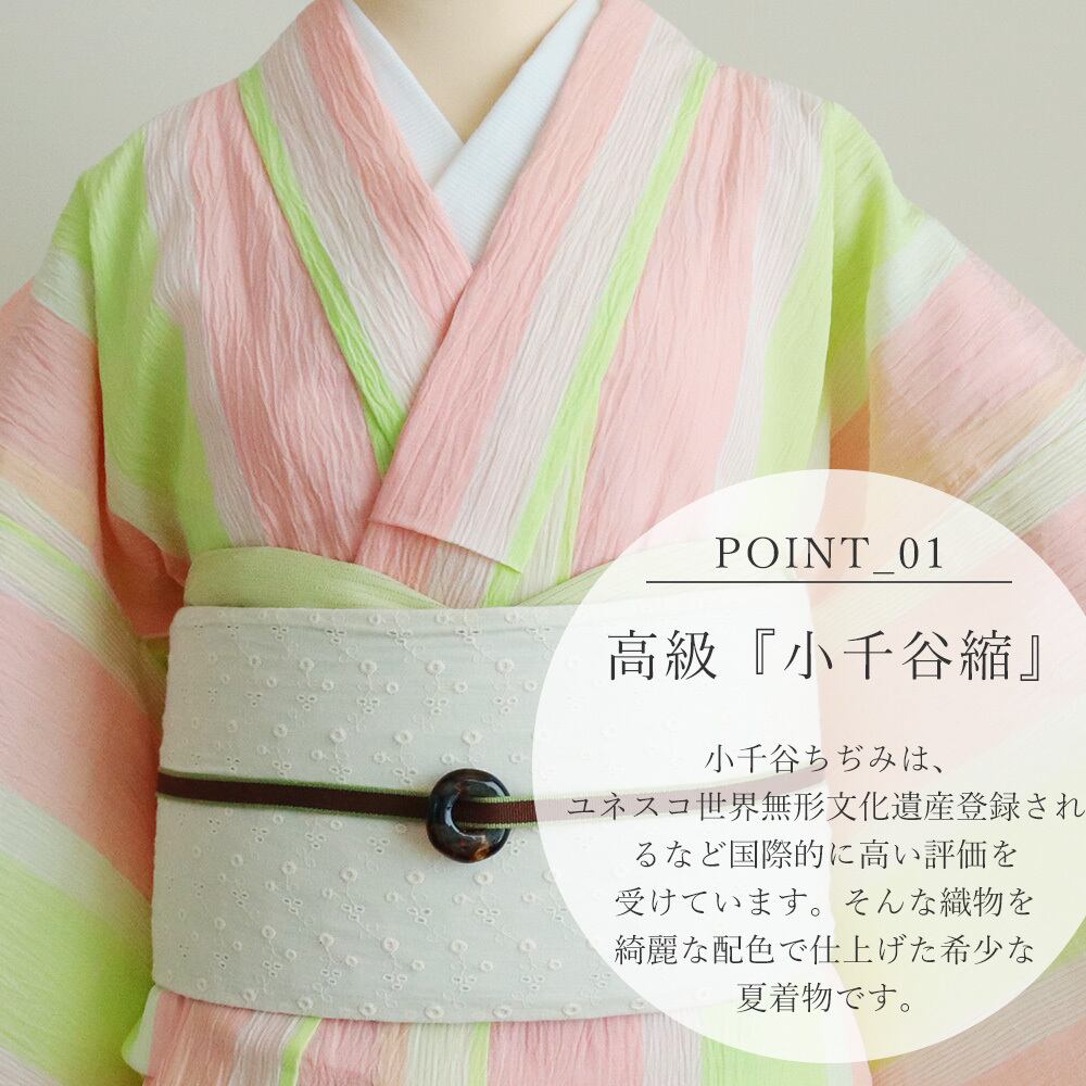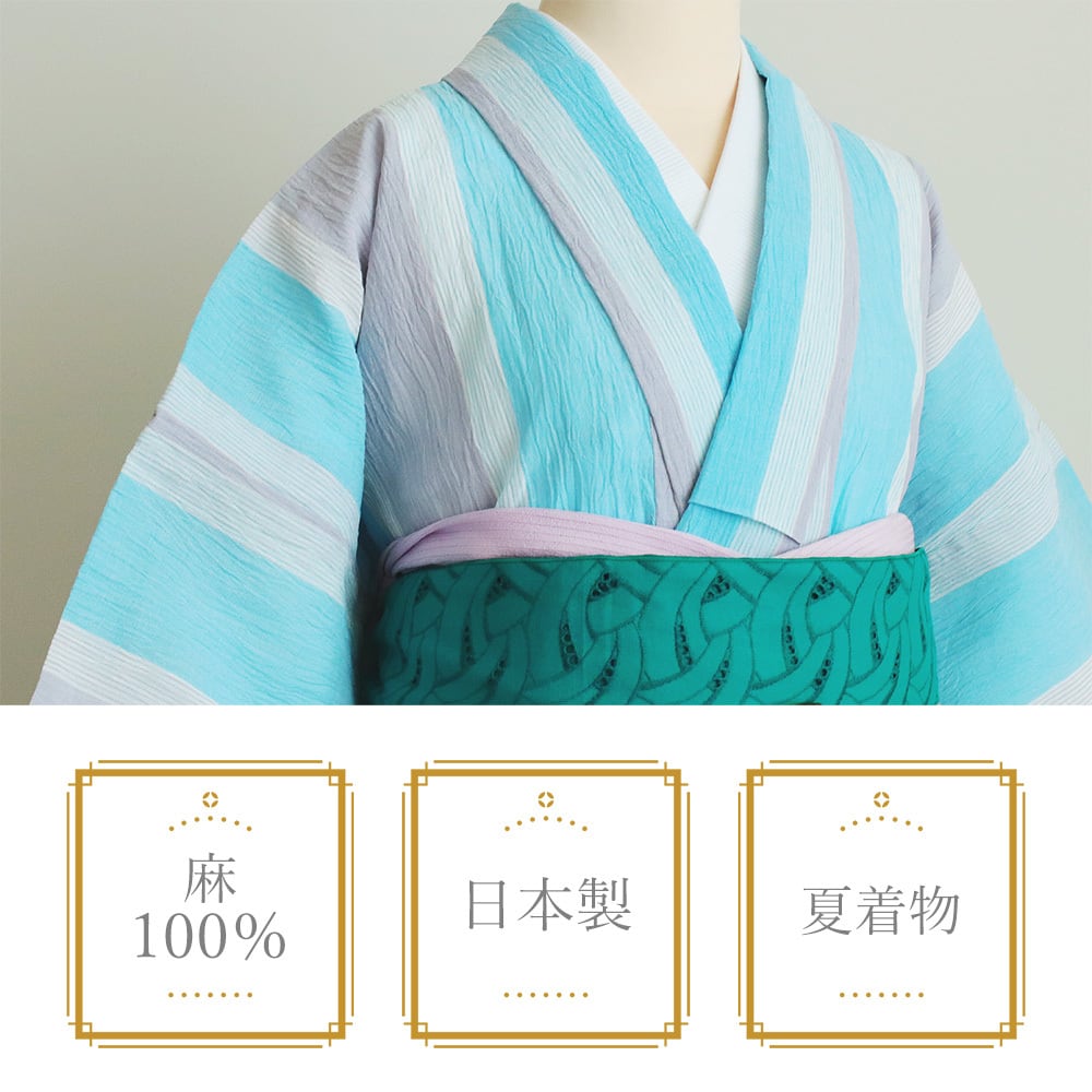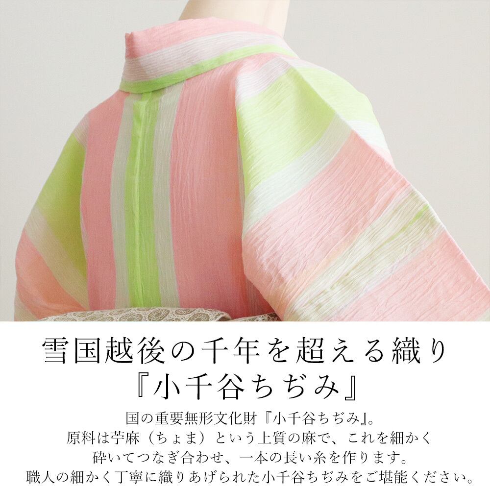 >雪国越後の千年を超える織り。「小千谷ちぢみ」国の重要無形文化財でもある小千谷縮の原料は苧麻という上質な麻でこれを細かく砕いてつなぎ合わせ一本の長い糸を作ります。そんな糸を職人の技術で織り上げて湯もみされ、丁寧に作られる生地です。麻100%のシャリ感と清涼感、また湯もみされてシワ加工ができることで、肌に密着しにくく風通しの良い涼しい生地となります。日本の湿度の高い夏に大変重宝される貴重な高級夏着物。是非その希少価値の高いお着物をご堪能ください。