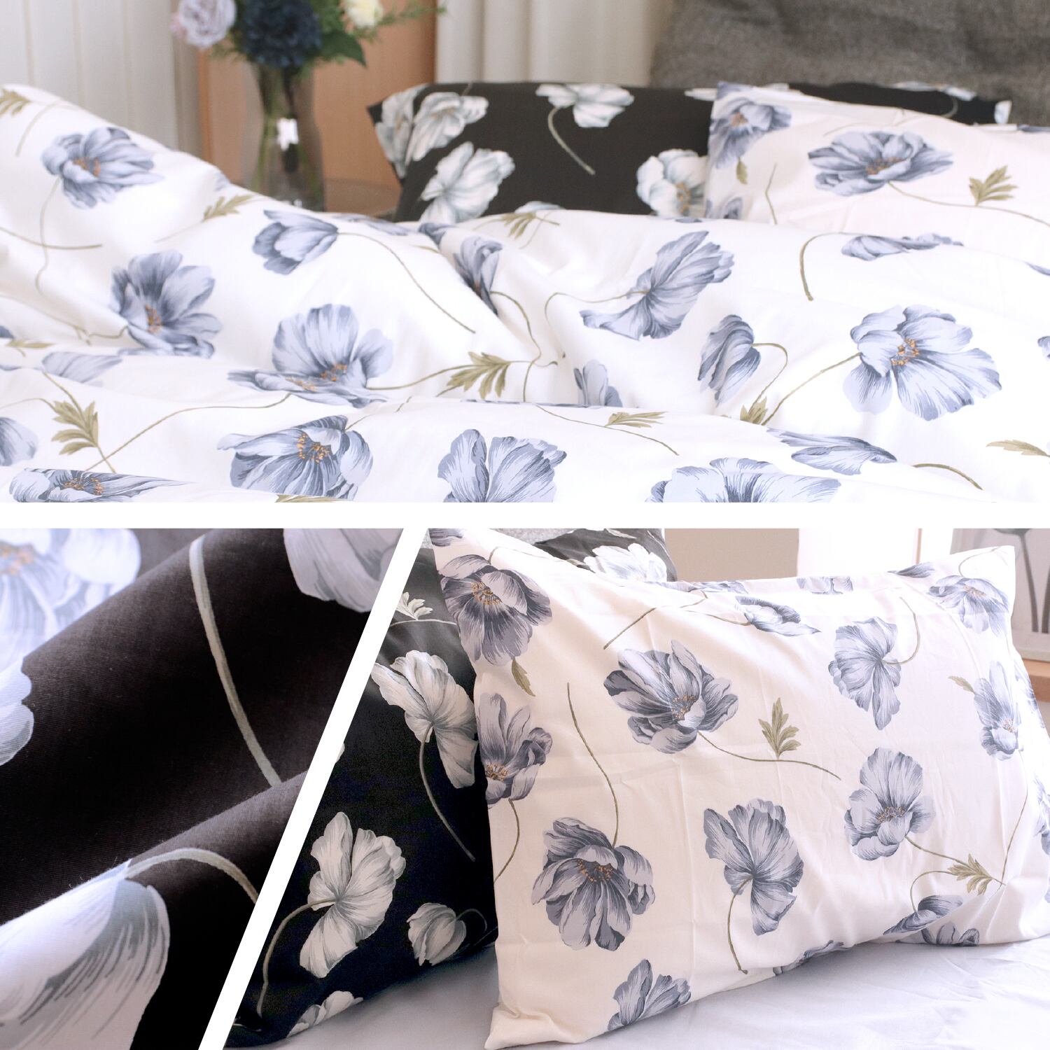 エレガントな花柄のルイーゼ。生地は、ワイシャツやブラウスなどによく使われるブロードを使用しており、なめらかな手触りが特徴です。ブロードは密に織られた平織の織物で軽さと丈夫さを合わせ持つベッドリネンにぴったりの生地です。裏地部分には抗菌・防臭加工も施されています。また、綿100%素材なので吸湿性と通気性に優れた肌に優しいカバーリングです。