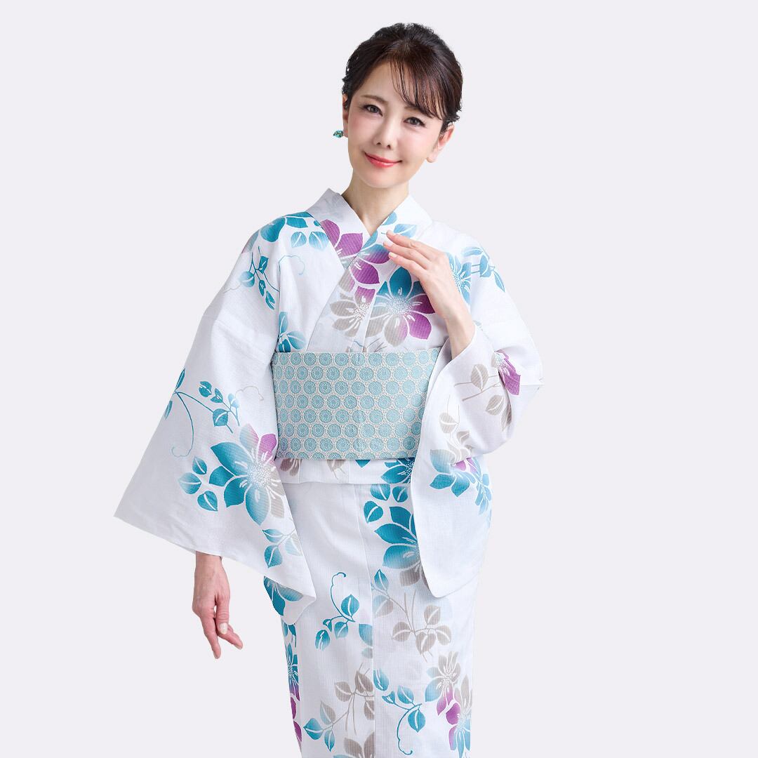 IKS COLLECTIONのレディース浴衣「彩」は、注染染めの浴衣です。白地にナチュラルな花柄が注染独特の染めぼかしにより、淡く儚げに描かれています。大人可愛いデザインで楽しみいただける高級浴衣を是非。日本製の上品でかわいいデザインが、夏の装いを一層引き立てます。