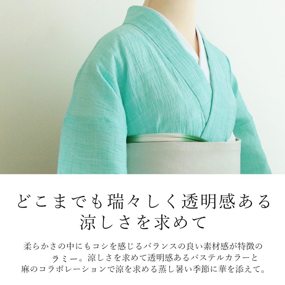 どこまでも瑞々しく透明感ある涼しさを求めて。柔らかさの中にもコシを感じるバランスの良い素材感が特徴の麻。透明感あるパステルカラーと麻のコラボレーションで涼しさを求める蒸し暑い季節に華を添えて。夏着物をより楽しんでいただく為に、帯や衿を変えて無地のお着物をお楽しみいただけたらと思います。あなたらしく艶やかに、シワを表現した通気性の良い麻100%の夏着物です。