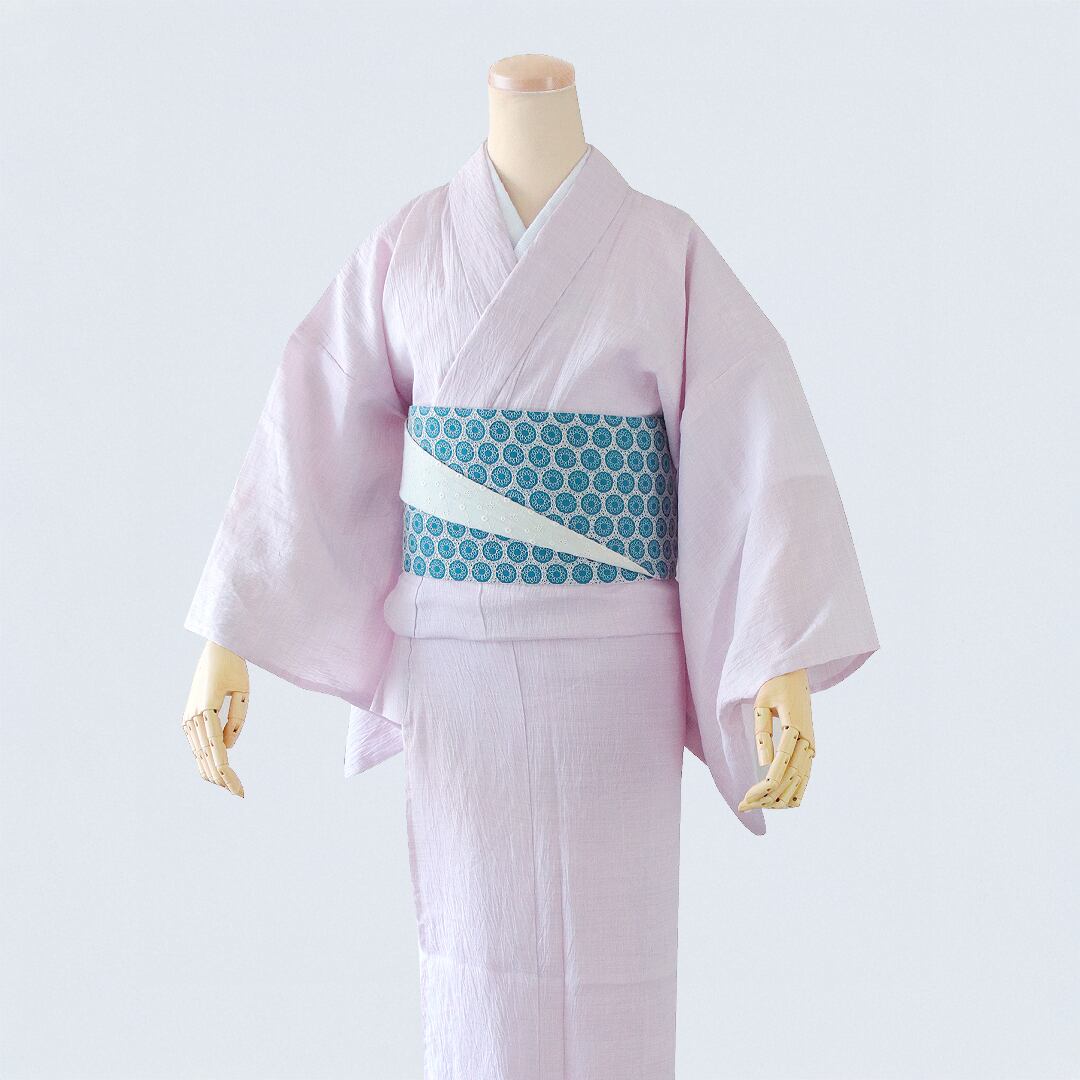 どこまでも瑞々しく透明感ある涼しさを求めて。柔らかさの中にもコシを感じるバランスの良い素材感が特徴の麻。透明感あるパステルカラーと麻のコラボレーションで涼しさを求める蒸し暑い季節に華を添えて。夏着物をより楽しんでいただく為に、帯や衿を変えて無地のお着物をお楽しみいただけたらと思います。あなたらしく艶やかに、シワを表現した通気性の良い麻100%の夏着物です。
