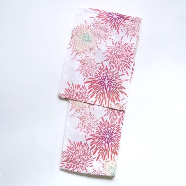 彩【No.04__花火】 夏の夜を彩る、注染染めのピンクの花火。 真っ白な生地に、鮮やかに咲くピンクの花火。日本の伝統技法「注染」によって染め上げられたこの浴衣は、夏の風物詩を纏うような美しさを誇ります。 IKSは、洗練された大人の女性のカジュアルな着物ライフを応援する為に、レースや独特の素材を使い他にはないような上品さと華やかさを併せ持つ和装商品を企画製造しています。
